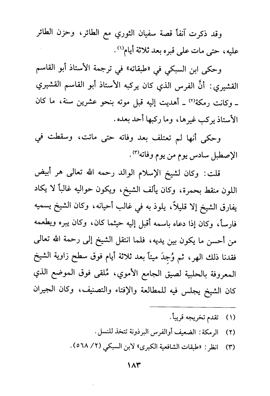 وحكى ابن السبكي في "طبقاته" في ترجمة الأستاذ أبو القاسم القشيري: أنَّ الفرس الذي كان يركبه الأستاذ أبو القاسم القشيري - وكانت رمكة (¬2) - أهديت إليه قبل موته بنحو عشرين سنة، ما كان الأستاذ يركب غيرها، وما ركبها أحد بعده.