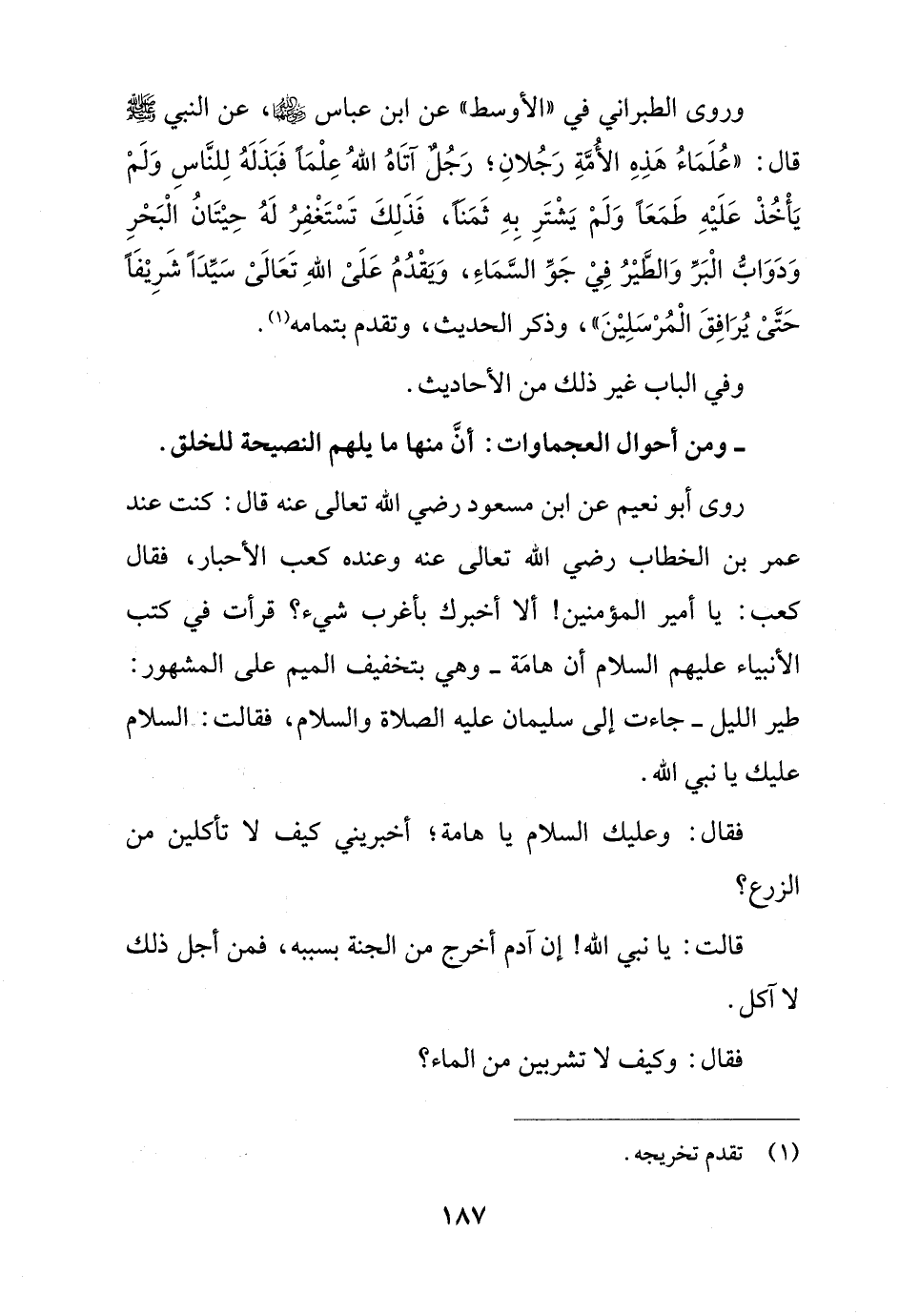 روى أبو نعيم عن ابن مسعود رضي الله تعالى عنه قال: كنت عند عمر بن الخطاب رضي الله تعالى عنه وعنده كعب الأحبار، فقال كعب: يا أمير المؤمنين! ألا أخبرك بأغرب شيء؟ قرأت في كتب الأنبياء عليهم السلام أن هامَة - وهي بتخفيف الميم على المشهور: طير الليل - جاءت إلى سليمان عليه الصلاة والسلام، فقالت: السلام عليك يا نبي الله.