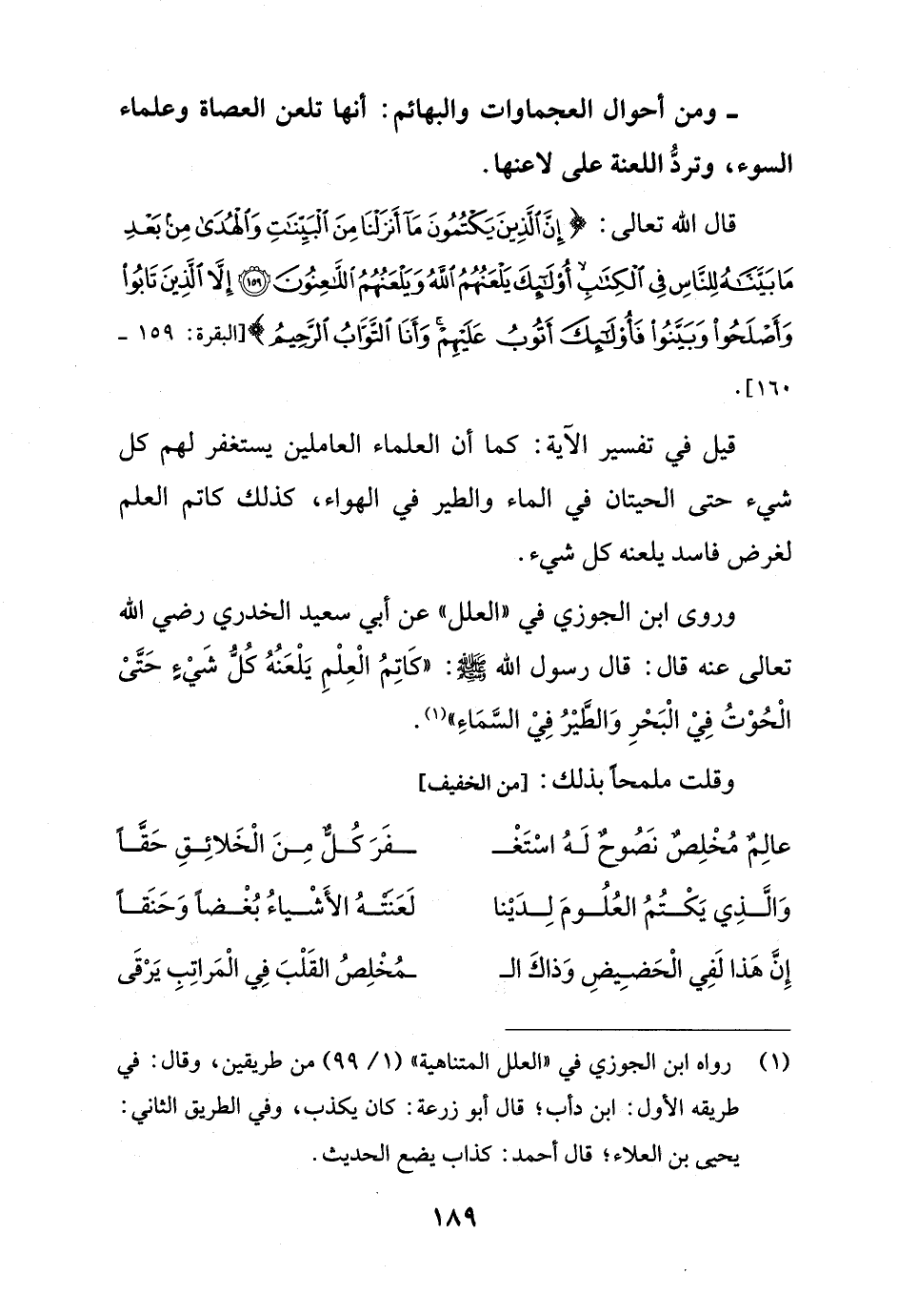 - ومن أحوال العجماوات والبهائم: أنها تلعن العصاة وعلماء السوء، وتردُّ اللعنة على لاعنها.