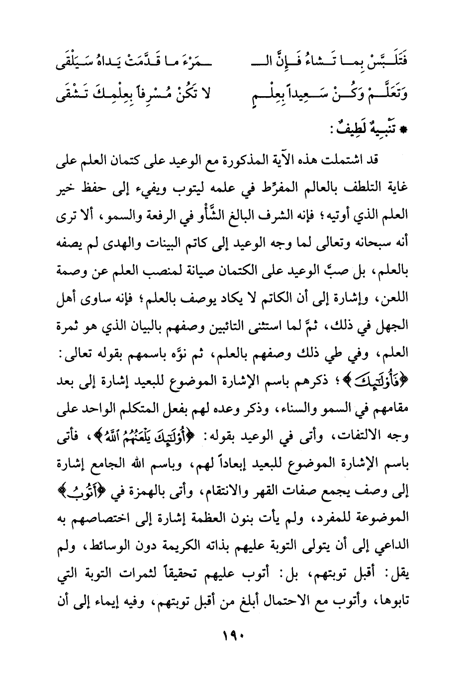 قد اشتملت هذه الآية المذكورة مع الوعيد على كتمان العلم على غاية التلطف بالعالم المفرِّط في علمه ليتوب ويفيء إلى حفظ خير العلم الذي أوتيه؛ فإنه الشرف البالغ الشَّأو في الرفعة والسمو، ألا ترى أنه سبحانه وتعالى لما وجه الوعيد إلى كاتم البينات والهدى لم يصفه بالعلم، بل صبَّ الوعيد على الكتمان صيانة لمنصب العلم عن وصمة اللعن، وإشارة إلى أن الكاتم لا يكاد يوصف بالعلم؛ فإنه ساوى أهل الجهل في ذلك، ثمَّ لما استثنى التائبين وصفهم بالبيان الذي هو ثمرة العلم، وفي طي ذلك وصفهم بالعلم، ثم نوَّه باسمهم بقوله تعالى: {فَأُولَئِكَ}؛ ذكرهم باسم الإشارة الموضوع للبعيد إشارة إلى بعد مقامهم في السمو والسناء، وذكر وعده لهم بفعل المتكلم الواحد على وجه الالتفات، وأتى في الوعيد بقوله: {أُولَئِكَ يَلْعَنُهُمُ اللَّهُ}، فأتى باسم الإشارة الموضوع للبعيد إبعاداً لهم، وباسم الله الجامع إشارة إلى وصف يجمع صفات القهر والانتقام، وأتى بالهمزة في {أَتُوبُ} الموضوعة للمفرد، ولم يأت بنون العظمة إشارة إلى اختصاصهم به الداعي إلى أن يتولى التوبة عليهم بذاته الكريمة دون الوسائط، ولم يقل: أقبل توبتهم، بل: أتوب عليهم تحقيقاً لثمرات التوبة التي تابوها، وأتوب مع الاحتمال أبلغ من أقبل توبتهم، وفيه إيماء إلى أن