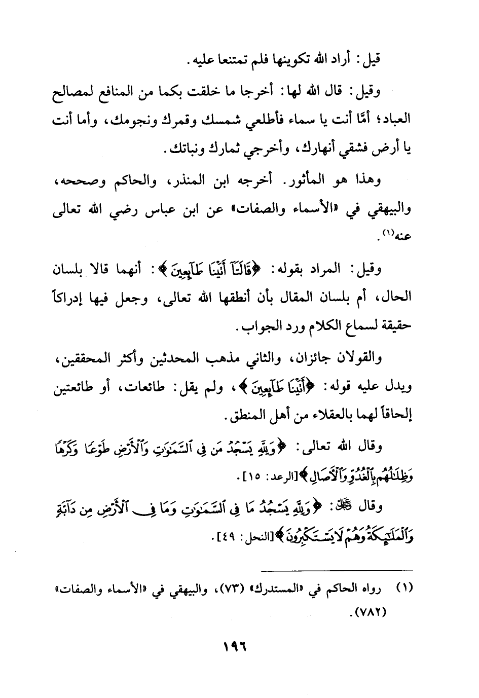 والقولان جائزان، والثاني مذهب المحدثين وأكثر المحققين، ويدل عليه قوله: {قَالَتَا أَتَيْنَا طَائِعِينَ}، ولم يقل: طائعات، أو طائعتين إلحاقاً لهما بالعقلاء من أهل المنطق.