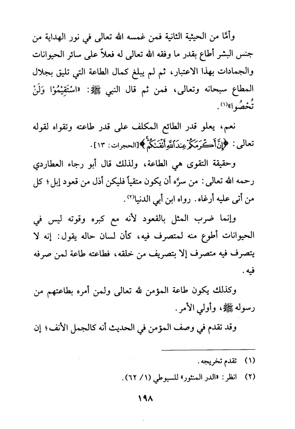 وأمَّا من الحيثية الثانية فمن غمسه الله تعالى في نور الهداية من جنس البشر أطاع بقدر ما وفقه الله تعالى له فعلاً على سائر الحيوانات والجمادات بهذا الاعتبار، ثم لم يبلغ كمال الطاعة التي تليق بجلال المطاع سبحانه وتعالى، فمن ثم قال النبي - صلى الله عليه وسلم -: "اسْتَقِيْمُوْا وَلَنْ تُحْصُوا" (¬1).
