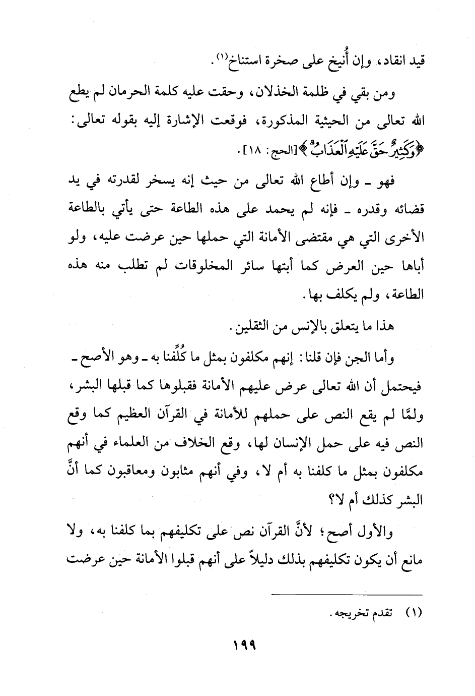 وأما الجن فإن قلنا: إنهم مكلفون بمثل ما كُلِّفنا به - وهو الأصح - فيحتمل أن الله تعالى عرض عليهم الأمانة فقبلوها كما قبلها البشر، ولمَّا لم يقع النص على حملهم للأمانة في القرآن العظيم كما وقع النص فيه على حمل الإنسان لها، وقع الخلاف من العلماء في أنهم مكلفون بمثل ما كلفنا به أم لا، وفي أنهم مثابون ومعاقبون كما أنَّ البشر كذلك أم لا؟