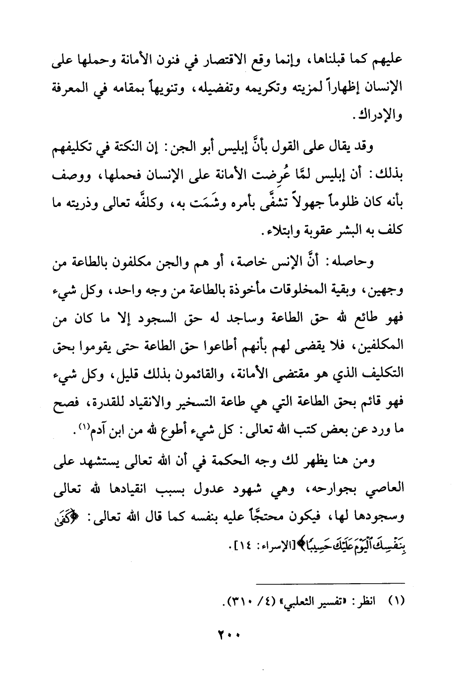 وحاصله: أنَّ الإنس خاصة، أو هم والجن مكلفون بالطاعة من وجهين، وبقية المخلوقات مأخوذة بالطاعة من وجه واحد، وكل شيء فهو طائع لله حق الطاعة وساجد له حق السجود إلا ما كان من المكلفين، فلا يقضى لهم بأنهم أطاعوا حق الطاعة حتى يقوموا بحق التكليف الذي هو مقتضى الأمانة، والقائمون بذلك قليل، وكل شيء فهو قائم بحق الطاعة التي هي طاعة التسخير والانقياد للقدرة، فصح ما ورد عن بعض كتب الله تعالى: كل شيء أطوع لله من ابن آدم (¬1).
