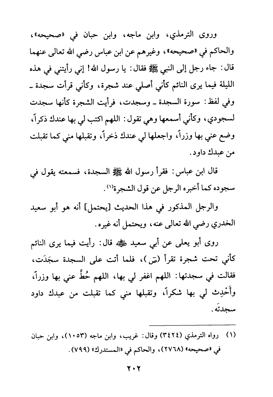 وروى الترمذي، وابن ماجه، وابن حبان في "صحيحه"، والحاكم في "صحيحه"، وغيرهم عن ابن عباس رضي الله تعالى عنهما قال: جاء رجل إلى النبي - صلى الله عليه وسلم - فقال: يا رسول الله! إني رأيتني في هذه الليلة فيما يرى النائم كأني أصلي عند شجرة، وكأني قرأت سجدة - وفي لفظ: سورة السجدة - وسجدت، فرأيت الشجرة كأنها سجدت لسجودي، وكأني أسمعها وهي تقول: اللهم اكتب لي بها عندك ذكراً، وضع عني بها وزراً، واجعلها لي عندك ذخراً، وتقبلها مني كما تقبلت من عبدك داود.