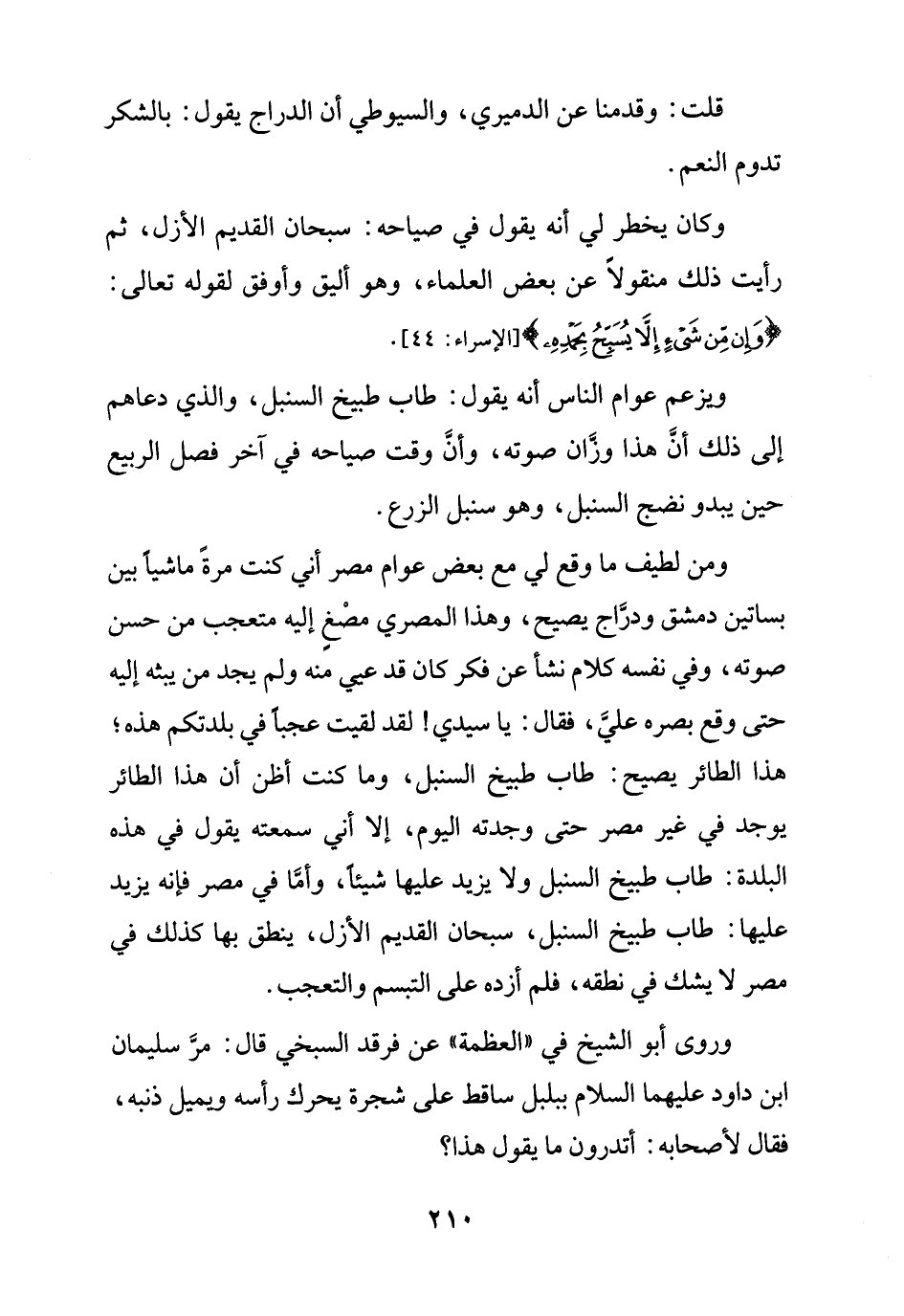 ومن لطيف ما وقع لي مع بعض عوام مصر أني كنت مرةً ماشياً بين بساتين دمشق ودرَّاج يصيح، وهذا المصري مصْغٍ إليه متعجب من حسن صوته، وفي نفسه كلام نشأ عن فكر كان قد عيي منه ولم يجد من يبثه إليه حتى وقع بصره عليَّ، فقال: يا سيدي! لقد لقيت عجباً في بلدتكم هذه؛ هذا الطائر يصيح: طاب طبيخ السنبل، وما كنت أظن أن هذا الطائر يوجد في غير مصر حتى وجدته اليوم، إلا أني سمعته يقول في هذه البلدة: طاب طبيخ السنبل ولا يزيد عليها شيئاً، وأمَّا في مصر فإنه يزيد عليها: طاب طبيخ السنبل، سبحان القديم الأزل، ينطق بها كذلك في مصر لا يشك في نطقه، فلم أزده على التبسم والتعجب.
