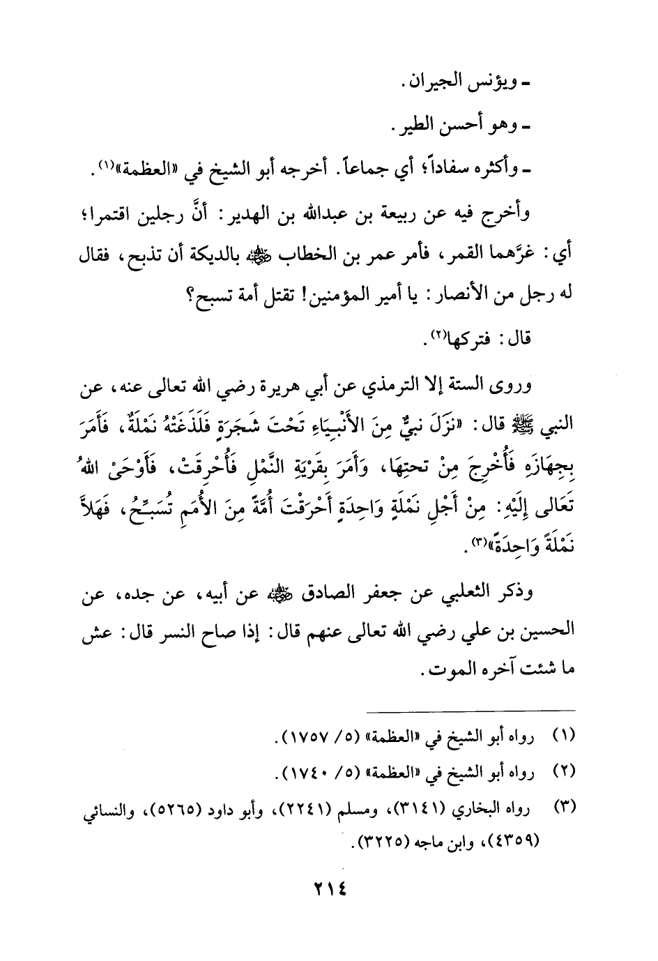 وروى الستة إلا الترمذي عن أبي هريرة رضي الله تعالى عنه، عن النبي - صلى الله عليه وسلم - قال: "نزَلَ نبيٌّ مِنَ الأَنْبِيَاءِ تَحْتَ شَجَرَةٍ فَلَذَغَتْهُ نَمْلَةٌ، فَأَمَرَ بِجِهَازهِ فَأُخْرِجَ مِنْ تحتِهَا، وَأَمَرَ بِقَرْيَةِ النَّمْلِ فَأُحْرِقَتْ، فَأَوْحَىْ اللهُ تَعَالى إِلَيْهِ: مِنْ أَجْلِ نَمْلَةٍ وَاحِدَةٍ أَحْرَقْتَ أُمَّةً مِنَ الأُمَمِ تُسَبِّحُ، فَهَلاَّ نَمْلَةً وَاحِدَةً" (¬3).