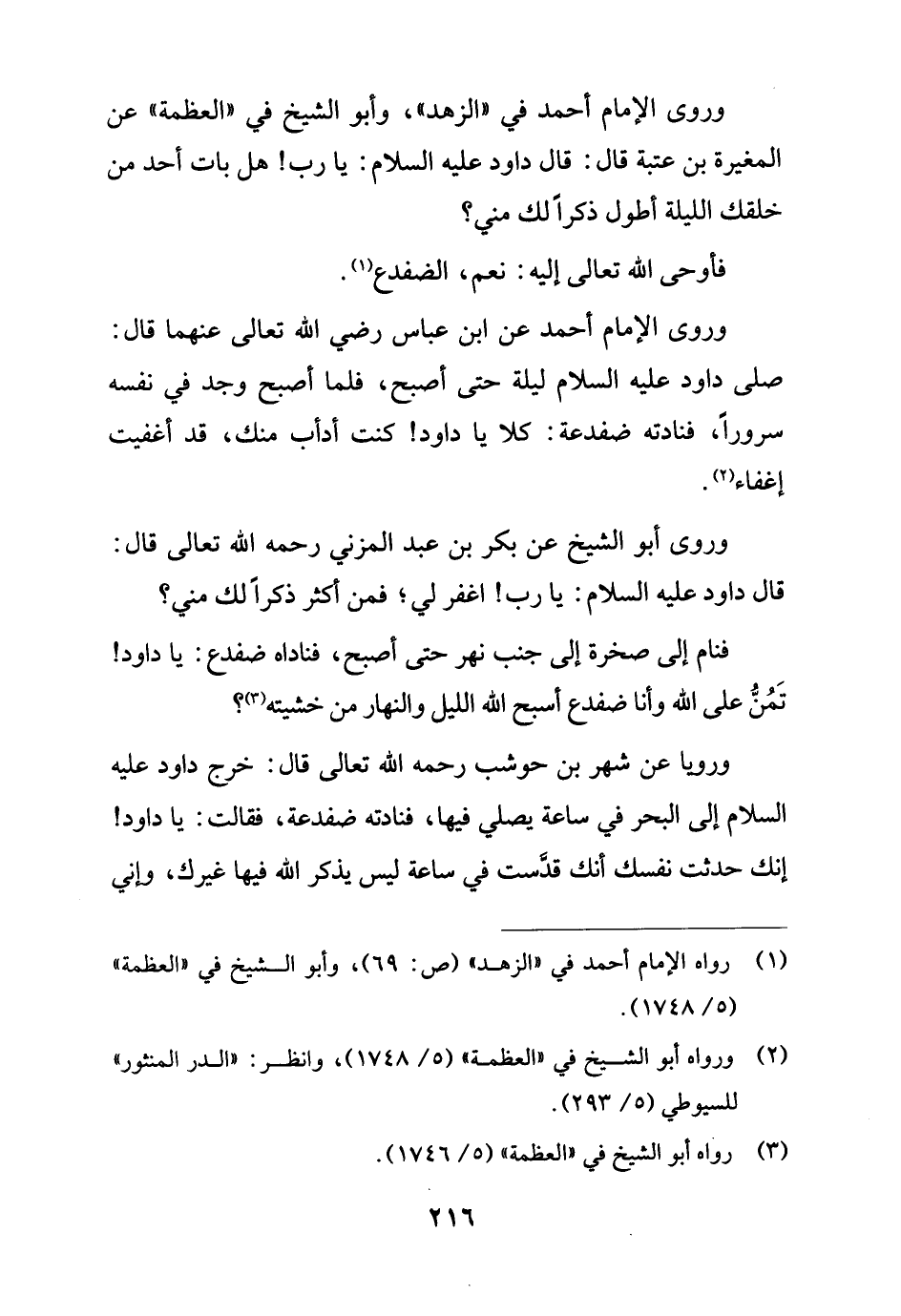 وروى الإمام أحمد في "الزهد"، وأبو الشيخ في "العظمة" عن المغيرة بن عتبة قال: قال داود عليه السلام: يا رب! هل بات أحد من خلقك الليلة أطول ذكراً لك مني؟