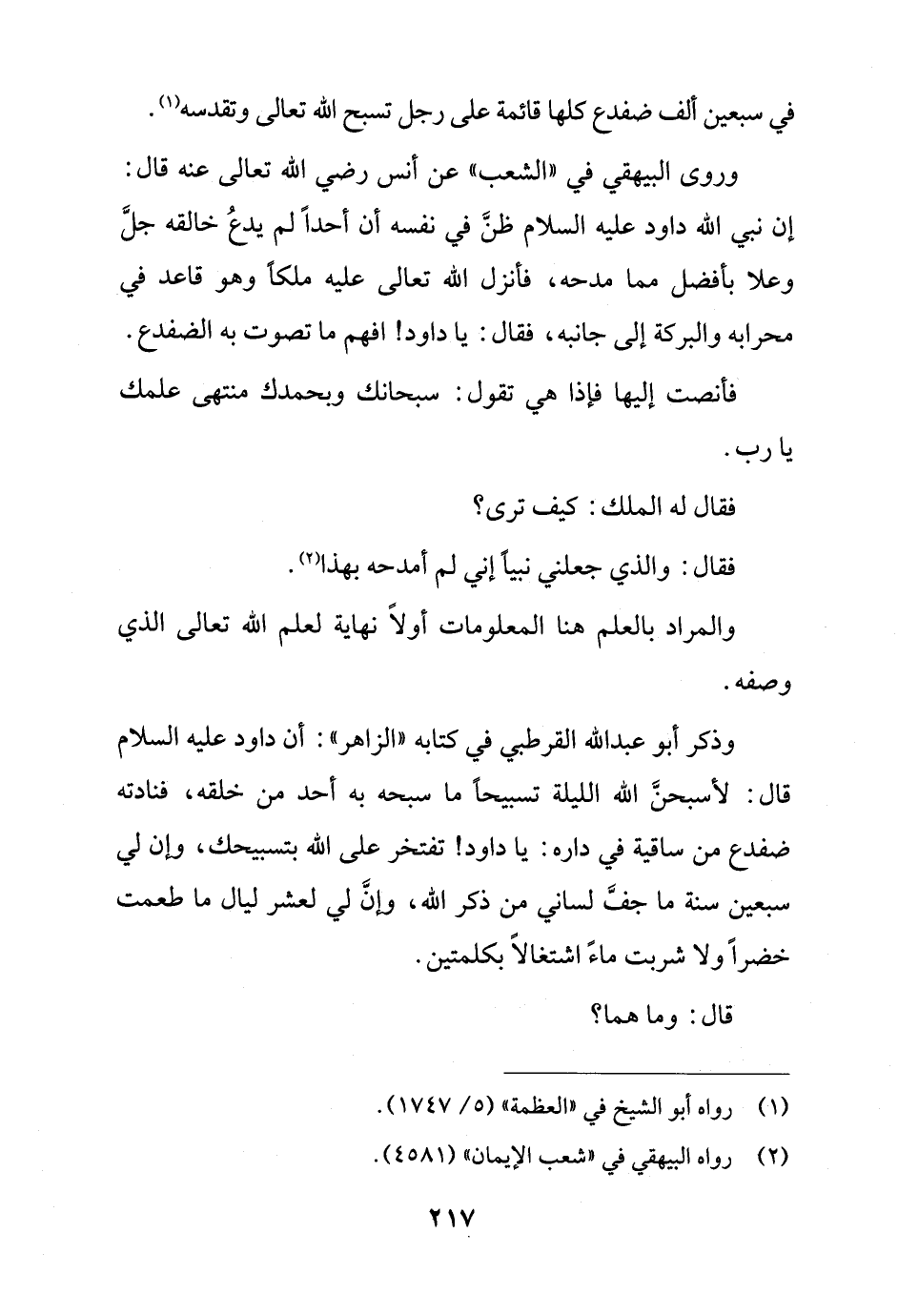 وذكر أبو عبد الله القرطبي في كتابه "الزاهر": أن داود عليه السلام قال: لأسبحنَّ الله الليلة تسبيحاً ما سبحه به أحد من خلقه، فنادته ضفدع من ساقية في داره: يا داود! تفتخر على الله بتسبيحك، وإن لي سبعين سنة ما جفَّ لساني من ذكر الله، وإنَّ لي لعشر ليال ما طعمت خضراً ولا شربت ماءً اشتغالاً بكلمتين.