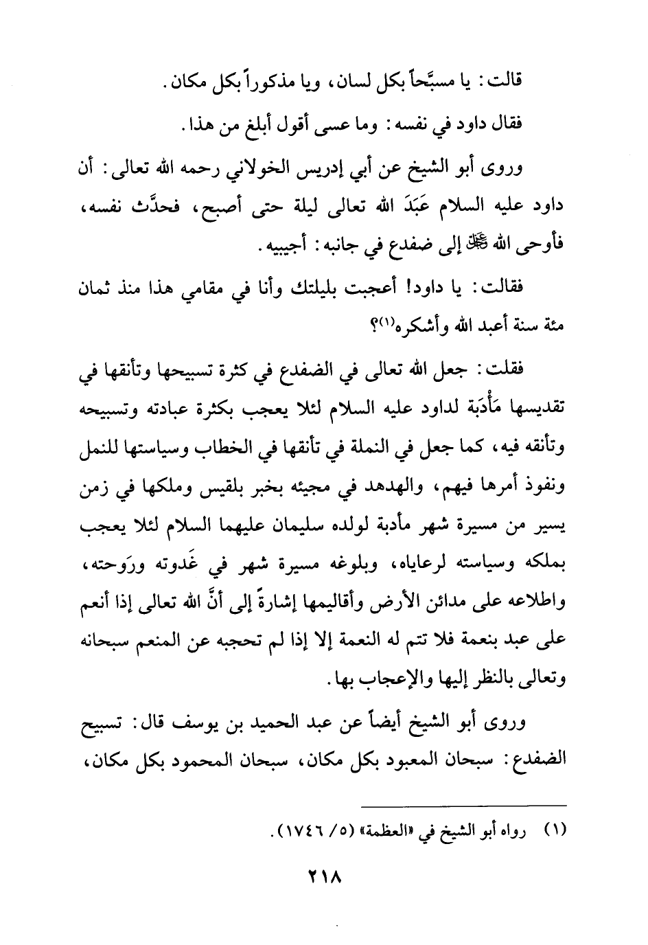 وروى أبو الشيخ عن أبي إدريس الخولاني رحمه الله تعالى: أن داود عليه السلام عَبَدَ الله تعالى ليلة حتى أصبح، فحدَّث نفسه، فأوحى الله - عز وجل - إلى ضفدع في جانبه: أجيبيه.