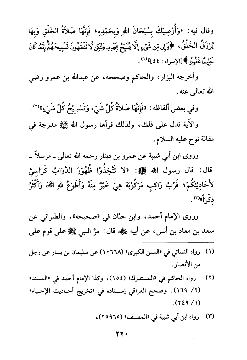 وقال فيه: "وَأُوْصِيْكَ بِسُبْحَانَ اللهِ وَبِحَمْدهِ؛ فَإِنَّهَا صَلاَةُ الخَلْقِ وَبِهَا يُرْزَقُ الخَلْقُ، {وَإِنْ مِنْ شَيْءٍ إِلَّا يُسَبِّحُ بِحَمْدِهِ وَلَكِنْ لَا تَفْقَهُونَ تَسْبِيحَهُمْ إِنَّهُ كَانَ حَلِيمًا غَفُورًا} [الإسراء: 44] " (¬1).