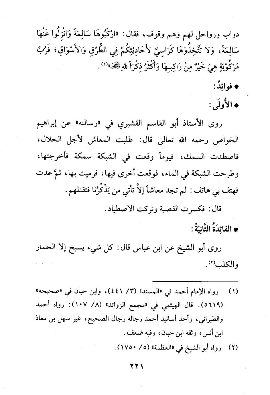 روى الأستاذ أبو القاسم القشيري في "رسالته" عن إبراهيم الخواص رحمه الله تعالى قال: طلبت المعاش لأجل الحلال، فاصطدت السمك، فيوماً وقعت في الشبكة سمكة فأخرجتها، وطرحت الشبكة في الماء، فوقعت أخرى فيها، فرميت بها، ثمَّ عدت فهتف بي هاتف: لم تجد معاشاً إلَّا تأتي من يَذْكُرُنا فتقتلهم.