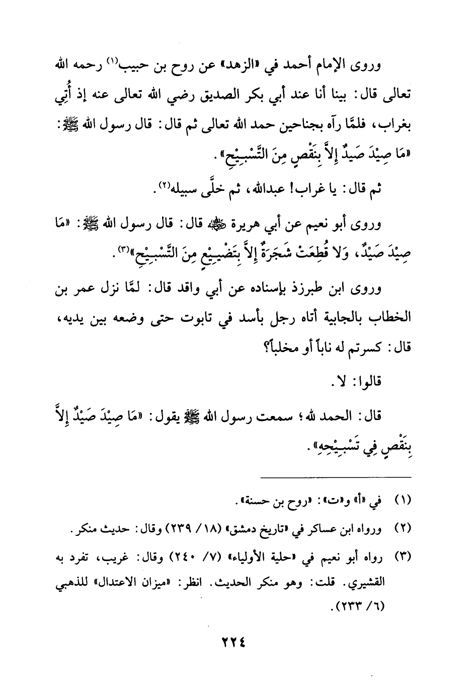 وروى الإمام أحمد في "الزهد" عن روح بن حبيب (¬1) رحمه الله تعالى قال: بينا أنا عند أبي بكر الصديق رضي الله تعالى عنه إذ أُتِي بغراب، فلمَّا رآه بجناحين حمد الله تعالى ثم قال: قال رسول الله - صلى الله عليه وسلم -: "مَا صِيْدَ صَيدٌ إِلاَّ بِنَقْصٍ مِنَ التَّسْبِيْحِ".