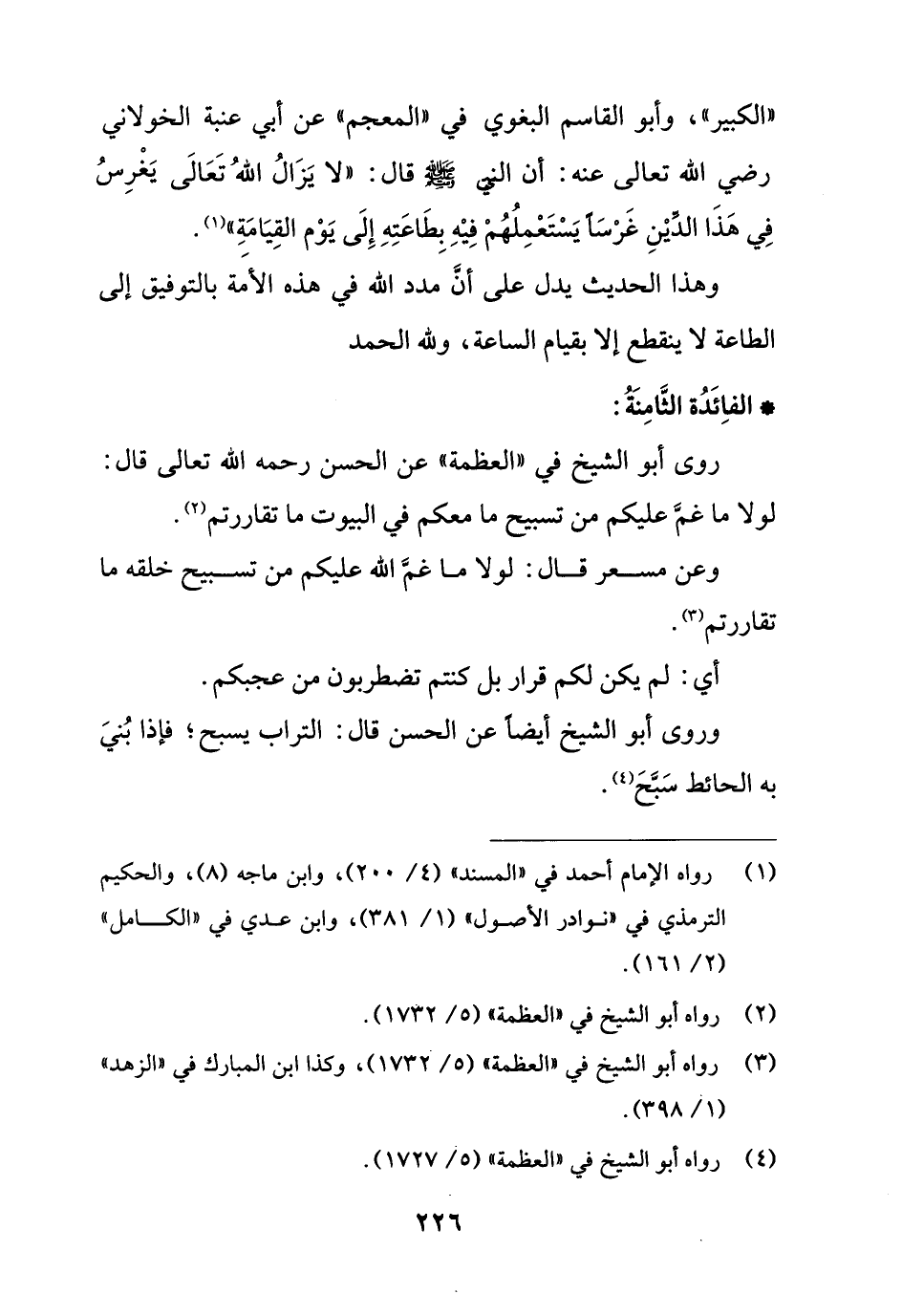 روى أبو الشيخ في "العظمة" عن الحسن رحمه الله تعالى قال: لولا ما غمَّ عليكم من تسبيح ما معكم في البيوت ما تقاررتم (¬2).