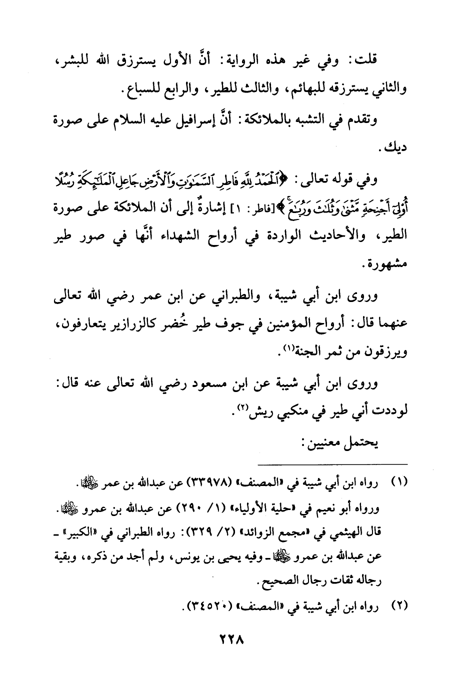 وفي قوله تعالى: {الْحَمْدُ لِلَّهِ فَاطِرِ السَّمَاوَاتِ وَالْأَرْضِ جَاعِلِ الْمَلَائِكَةِ رُسُلًا أُولِي أَجْنِحَةٍ مَثْنَى وَثُلَاثَ وَرُبَاعَ} [فاطر: 1] إشارة إلى أن الملائكة على صورة الطير، والأحاديث الواردة في أرواح الشهداء أنَّها في صور طير مشهورة.