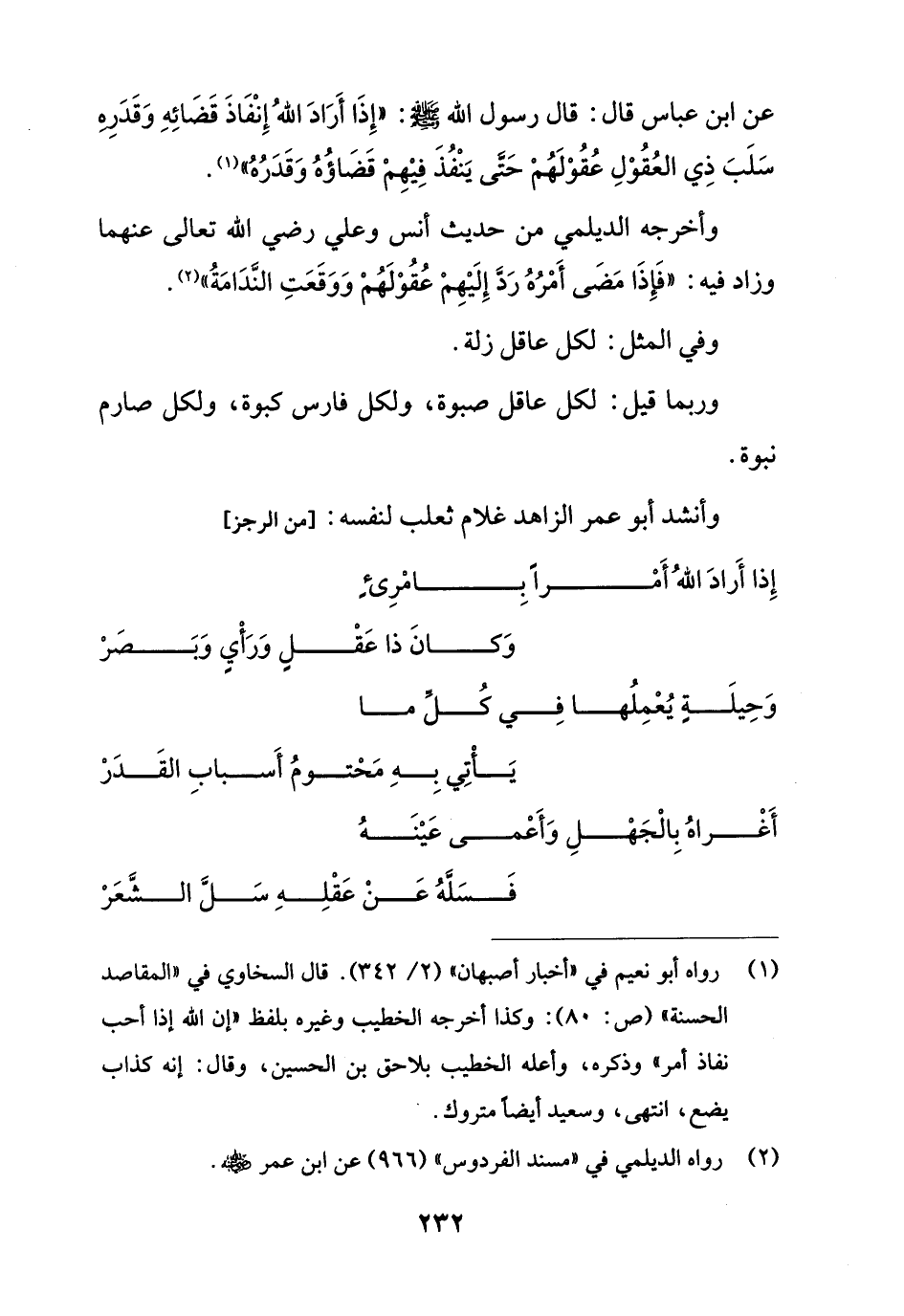 عن ابن عباس قال: قال رسول الله - صلى الله عليه وسلم -: "إِذَا أَرَادَ اللهُ إِنْفَاذَ قَضَائِهِ وَقَدَرهِ سَلَبَ ذِي العُقُوْلِ عُقُوْلَهُمْ حَتَّى يَنْفُذَ فِيْهِمْ قَضَاؤُهُ وَقَدَرُهُ" (¬1).