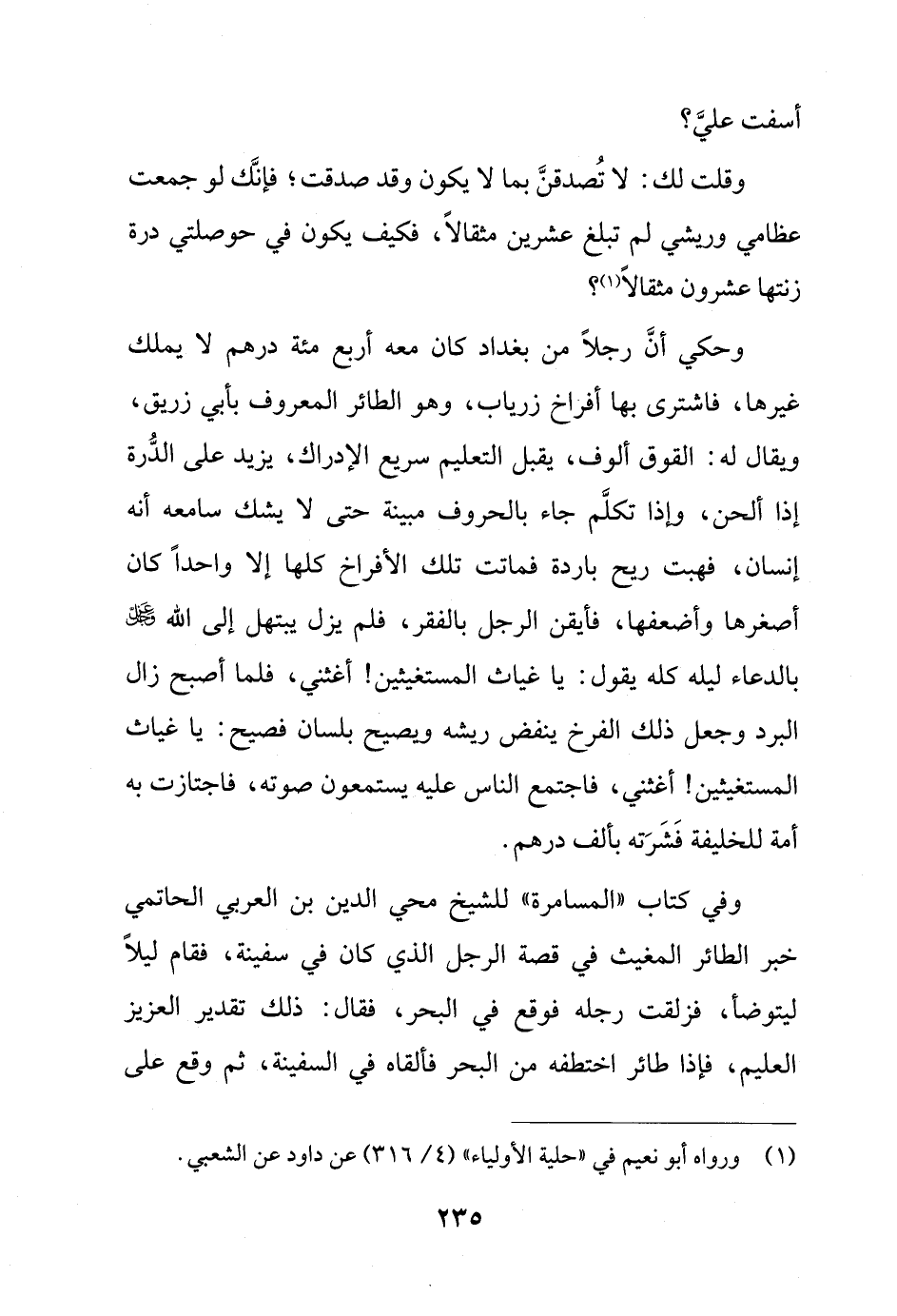 وفي كتاب "المسامرة" للشيخ محي الدين بن العربي الحاتمي خبر الطائر المغيث في قصة الرجل الذي كان في سفينة، فقام ليلاً ليتوضأ، فزلقت رجله فوقع في البحر، فقال: ذلك تقدير العزيز العليم، فإذا طائر اختطفه من البحر فألقاه في السفينة، ثم وقع على