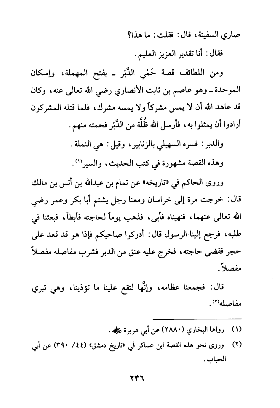 ومن اللطائف قصة حَمْي الدَّبْر - بفتح المهملة، وإسكان الموحدة - وهو عاصم بن ثابت الأنصاري رضي الله تعالى عنه، وكان قد عاهد الله أن لا يمس مشركاً ولا يمسه مشرك، فلما قتله المشركون أرادوا أن يمثلوا به، فأرسل الله ظُلَّة من الدَّبْر فحمته منهم.