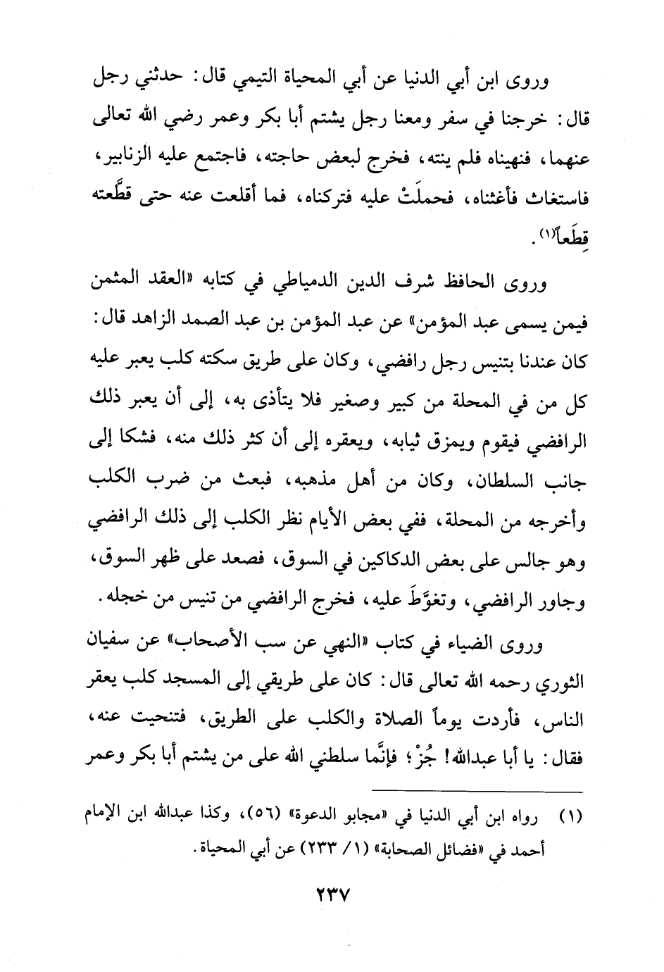 وروى الحافظ شرف الدين الدمياطي في كتابه "العقد المثمن فيمن يسمى عبد المؤمن" عن عبد المؤمن بن عبد الصمد الزاهد قال: كان عندنا بتنيس رجل رافضي، وكان على طريق سكته كلب يعبر عليه كل من في المحلة من كبير وصغير فلا يتأذى به، إلى أن يعبر ذلك الرافضي فيقوم ويمزق ثيابه، ويعقره إلى أن أكثر ذلك منه، فشكا إلى جانب السلطان، وكان من أهل مذهبه، فبعث من ضرب الكلب وأخرجه من المحلة، ففي بعض الأيام نظر الكلب إلى ذلك الرافضي وهو جالس على بعض الدكاكين في السوق، فصعد على ظهر السوق، وجاور الرافضي، وتغوَّطَ عليه، فخرج الرافضي من تنيس من خجله.