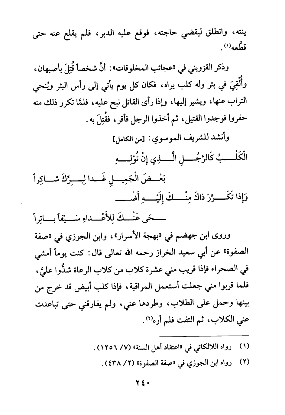 وروى ابن جهضم في "بهجة الأسرار"، وابن الجوزي في "صفة الصفوة" عن أبي سعيد الخراز رحمه الله تعالى قال: كنت يوماً أمشي في الصحراء فإذا قريب مني عشرة كلاب من كلاب الرعاة شدُّوا عليَّ، فلما قربوا مني جعلت أستعمل المراقبة، فإذا كلب أبيض قد خرج من بينها وحمل على الطلاب، وطردها عني، ولم يفارقني حتى تباعدت عني الكلاب، ثم التفت فلم أره (¬2).