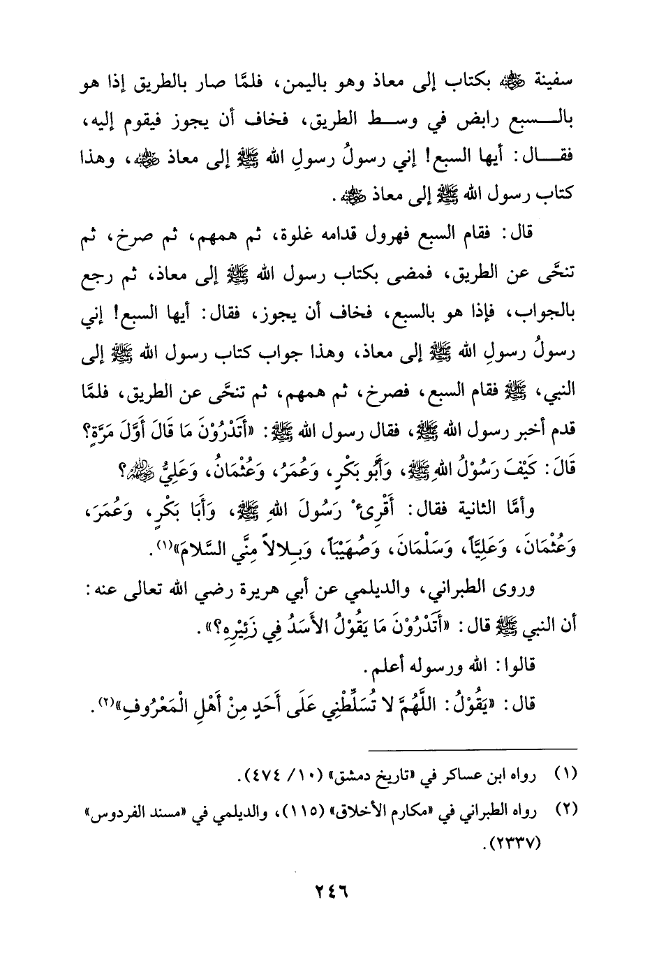قال: فقام السبع فهرول قدامه غلوة، ثم همهم، ثم صرخ، ثم تنحَّى عن الطريق، فمضى بكتاب رسول الله - صلى الله عليه وسلم - إلى معاذ، ثم رجع بالجواب، فإذا هو بالسبع، فخاف أن يجوز، فقال: أيها السبع! إني رسولُ رسولِ الله - صلى الله عليه وسلم - إلى معاذ، وهذا جواب كتاب رسول الله - صلى الله عليه وسلم - إلى النبي، - صلى الله عليه وسلم - فقام السبع، فصرخ، ثم همهم، ثم تنحَّى عن الطريق، فلمَّا قدم أخبر رسول الله - صلى الله عليه وسلم -، فقال رسول الله - صلى الله عليه وسلم -: "أتَدْرُوْنَ مَا قَالَ أَوَّلَ مَرَّة؟ قَالَ: كَيْفَ رَسُوْلُ اللهِ - صلى الله عليه وسلم -، وَأبُو بَكْرٍ، وَعُمَرُ، وَعُثْمَانُ، وَعَلِيٌّ - رضي الله عنه -؟
