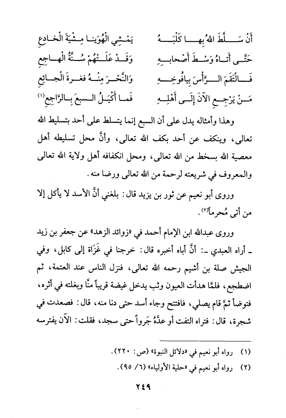 وهذا وأمثاله يدل على أن السبع إنما يتسلط على أحد بتسليط الله تعالى، وينكف عن أحد بكف الله تعالى، وأنَّ محل تسليطه أهل معصية الله بسخط من الله تعالى، ومحل انكفافه أهل ولاية الله تعالى والمعروف في شريعته لرحمة من الله تعالى ورضا منه.