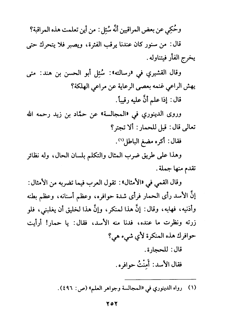 وروى الدينوري في "المجالسة" عن حمَّاد بن زيد رحمه الله تعالى قال: قيل للحمار: ألا تجتر؟