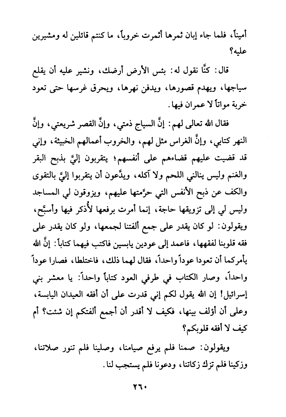 فقال الله تعالى لهم: إنَّ السياج ذمتي، وإنَّ القصر شريعتي، وإنَّ النهر كتابي، وإنَّ الغراس مثل لهم، والخروب أعمالهم الخبيثة، وإني قد قضيت عليهم قضاءهم على أنفسهم؛ يتقربون إليَّ بذبح البقر والغنم وليس ينالني اللحم ولا آكله، ويدَّعون أن يتقربوا إليَّ بالتقوى والكف عن ذبح الأنفس التي حرَّمتها عليهم، ويزوقون لي المساجد وليس لي إلى تزويقها حاجة، إنما أمرت برفعها لأُذكر فيها وأسبَّح، ويقولون: لو كان يقدر على جمع ألفتنا لجمعها، ولو كان يقدر على فقه قلوبنا لفقهها، فاعمد إلى عودين يابسين فاكتب فيهما كتاباً: إنَّ الله يأمركما أن تعودا عوداً واحداً، فقال لهما ذلك، فاختلطا، فصارا عوداً واحداً، وصار الكتاب في طرفي العود كتاباً واحداً: يا معشر بني إسرائيل! إن الله يقول لكم إني قدرت على أن أفقه العيدان اليابسة، وعلى أن أؤلف بينها، فكيف لا أقدر أن أجمع ألفتكم إن شئت؟