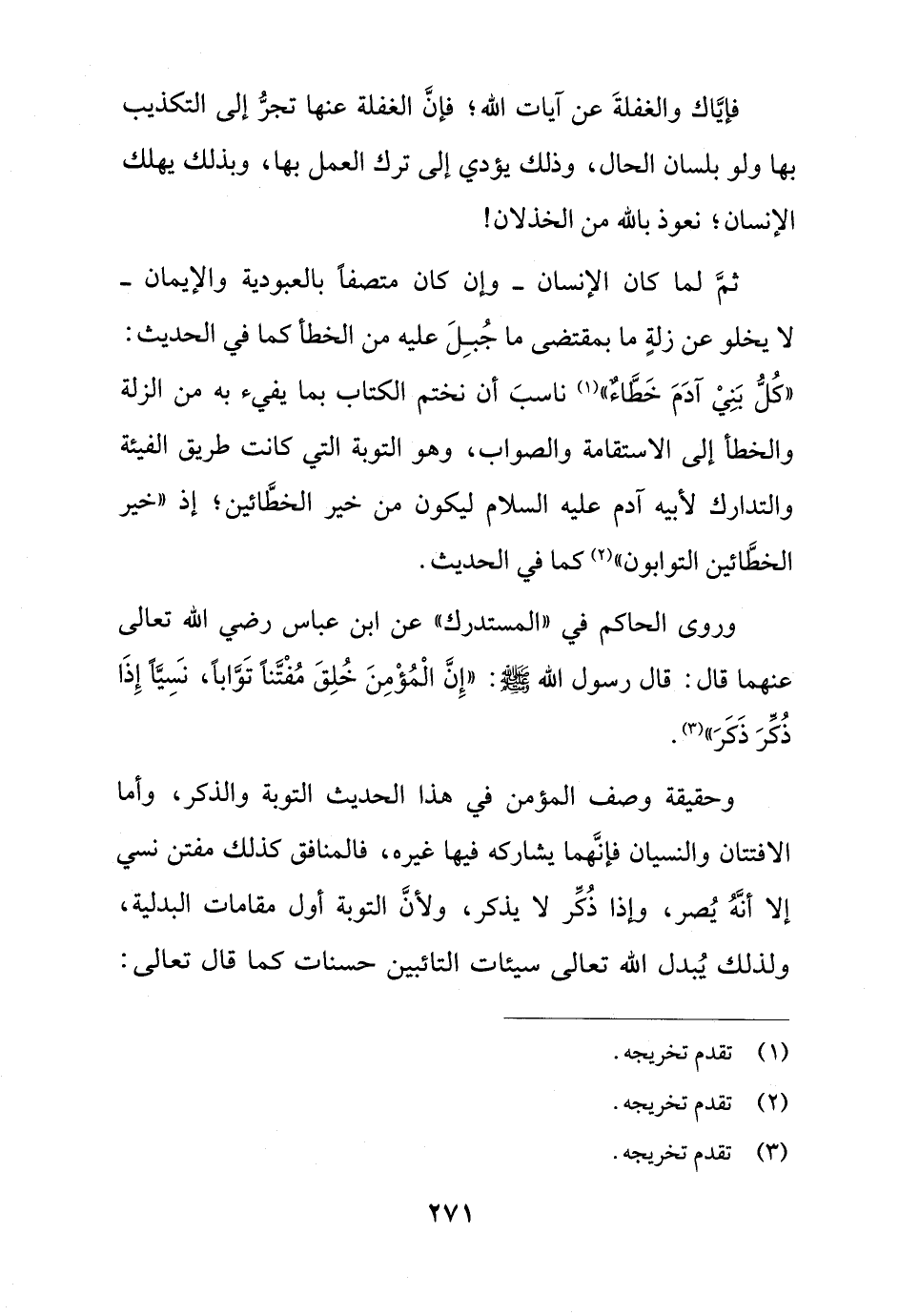 وروى الحاكم في "المستدرك" عن ابن عباس رضي الله تعالى عنهما قال: قال رسول الله - صلى الله عليه وسلم -: "إِنَّ الْمُؤْمِنَ خُلِقَ مُفْتَّناً تَوَّاباً، نَسِيًّا إِذَا ذُكِّرَ ذَكَرَ" (¬3).