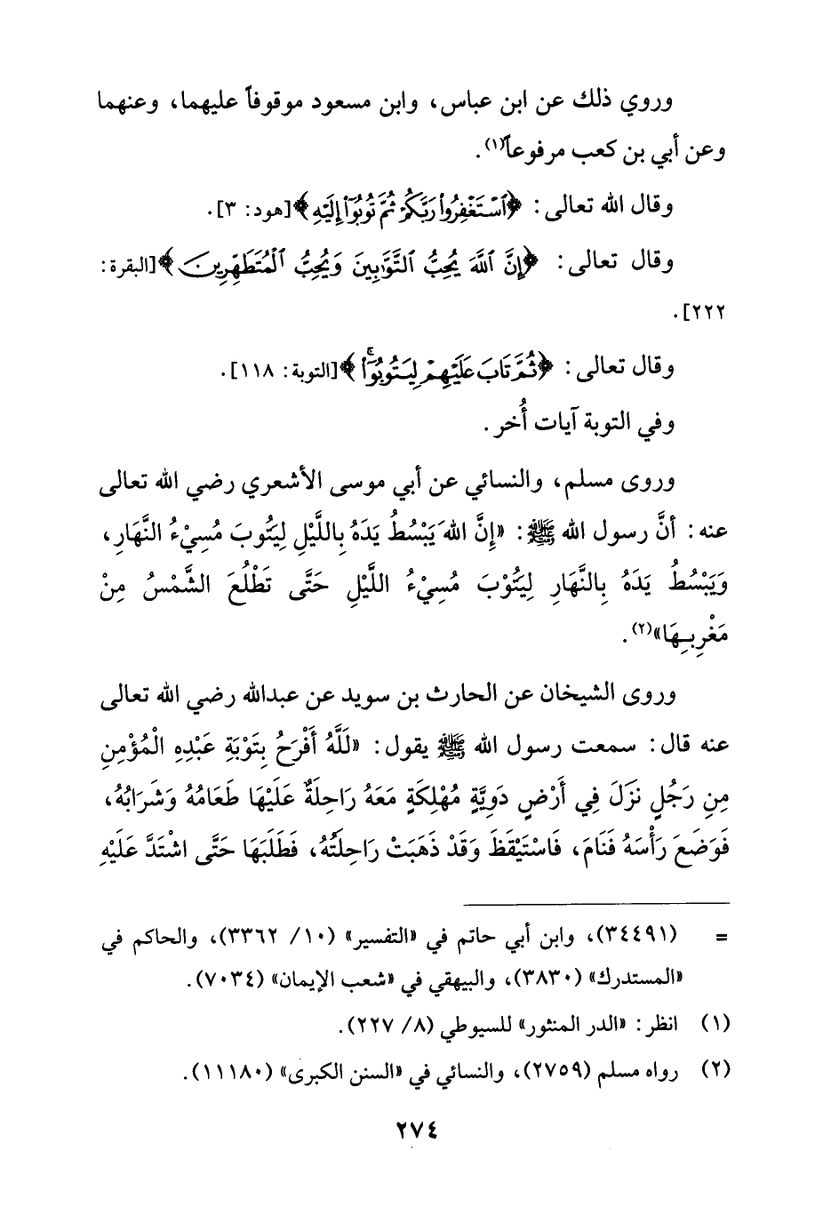 وروى مسلم، والنسائي عن أبي موسى الأشعري رضي الله تعالى عنه: أنَّ رسول الله - صلى الله عليه وسلم -: "إِنَّ اللهَ يَبْسُطُ يَدَهُ بِاللَّيْلِ لِيَتُوبَ مُسِيْءُ النَّهَارِ، وَيَبْسُطُ يَدَهُ بِالنَّهَارِ لِيَتُوْبَ مُسِيْءُ اللَّيْلِ حَتَّى تَطْلُعَ الشَّمْسُ مِنْ مَغْرِبِهَا" (¬2).