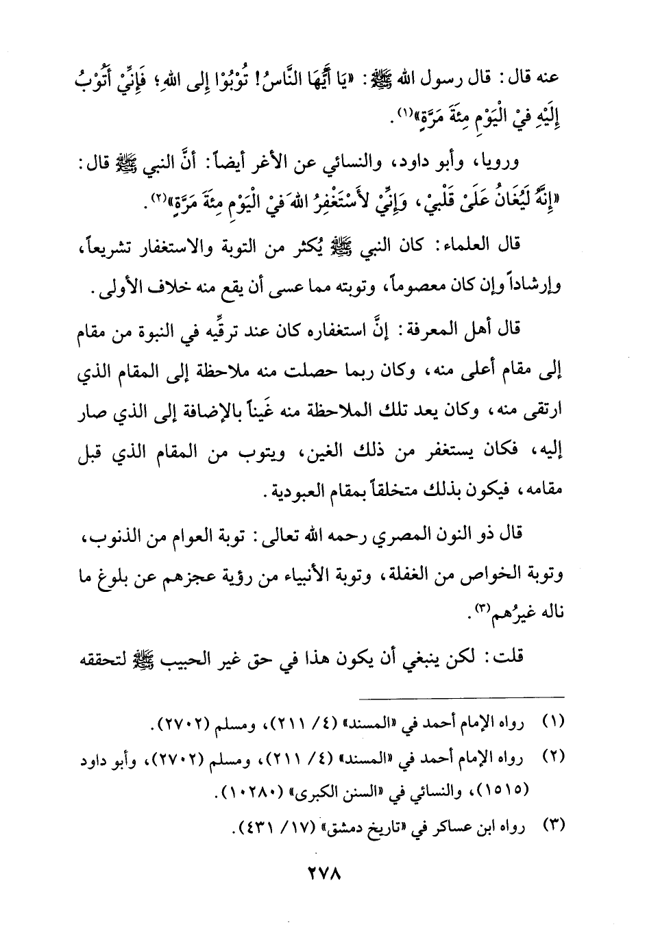 ورويا، وأبو داود، والنسائي عن الأغر أيضاً: أنَّ النبي - صلى الله عليه وسلم - قال: "إِنَّهُ لَيُغَانُ عَلَىْ قَلْبيْ، وَإِنِّيْ لأَسْتَغْفِرُ اللهَ فيْ الْيَوْمِ مِئَةَ مَرَّةٍ" (¬2).