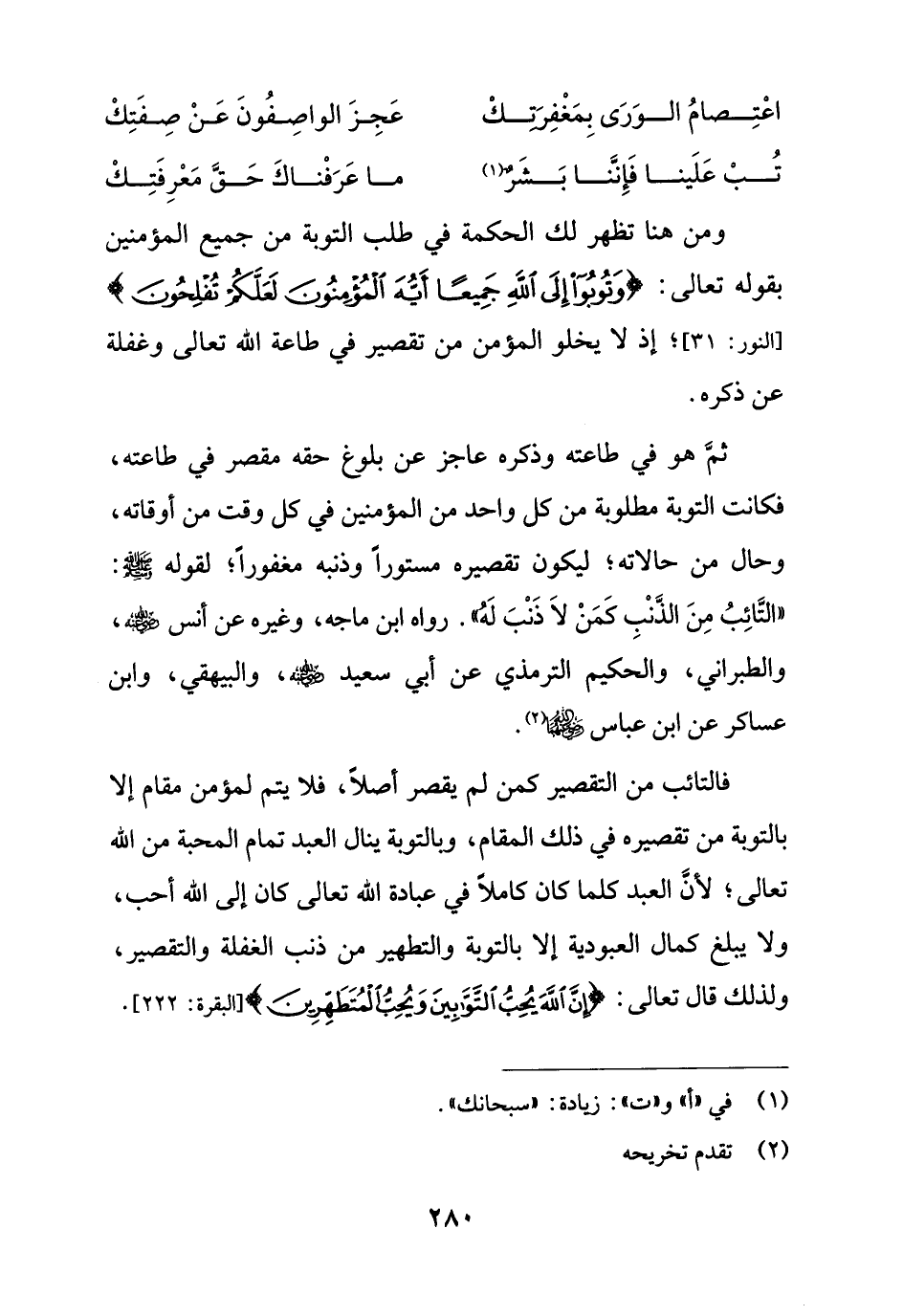 ثمَّ هو في طاعته وذكره عاجز عن بلوغ حقه مقصر في طاعته، فكانت التوبة مطلوبة من كل واحد من المؤمنين في كل وقت من أوقاته، وحال من حالاته؛ ليكون تقصيره مستوراً وذنبه مغفوراً؛ لقوله - صلى الله عليه وسلم -: "التَّائِبُ مِنَ الذَّنْبِ كَمَنْ لاَ ذَنْبَ لَه".