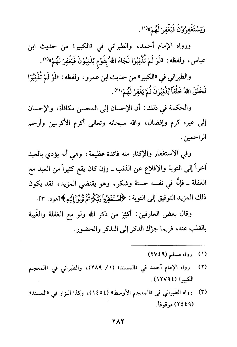 وفي الاستغفار والإكثار منه فائدة عظيمة، وهي أنه يؤدي بالعبد آخراً إلى التوبة والإقلاع عن الذنب - وإن كان يقع كثيراً من العبد مع الغفلة - فإنَّه في نفسه حسنة وشكر، وهو يقتضي المزيد، فقد يكون ذلك المزيد التوفيق إلى التوبة: {اسْتَغْفِرُوا رَبَّكُمْ ثُمَّ تُوبُوا إِلَيْهِ} [هود: 3].