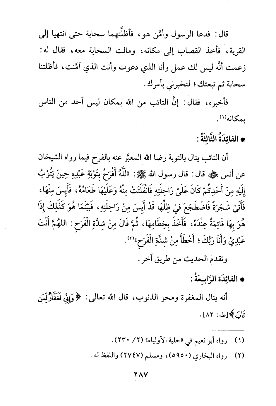 أن التائب ينال بالتوبة رضا الله المعبَّر عنه بالفرح فيما رواه الشيخان عن أنس - رضي الله عنه - قال: قال رسول الله - صلى الله عليه وسلم -: "لَلَّهُ أَفْرَحُ بِتَوْبَةِ عَبْدهِ حِينَ يَتُوْبُ إِلَيْهِ مِنْ أَحَدِكُمْ كَانَ عَلَىْ رَاحِلَتِهِ فَانْفَلَتَتْ مِنْهُ وَعَلَيْهَا طَعَامُهُ، فَأَيِسَ مِنْهَا، فَأتىْ شَجَرَةً فَاضْطَجَعَ فيْ ظِلِّهَا قَدْ أَيِسَ مِنْ رَاحِلَتِهِ، فَبَيْنَمَا هُوَ كَذَلِكَ إِذَا هُوَ بِهَا قَائِمَةٌ عِنْدَهُ، فَأَخَذَ بِخِطَامِهَا، ثُم قَالَ مِنْ شِدَّةِ الْفَرَحِ: اللهُمَّ أَنْتَ عَبْدِيْ وَأَنَا رَبُّكَ، أَخْطَأَ مِنْ شدَّةِ الْفَرَحِ" (¬2).