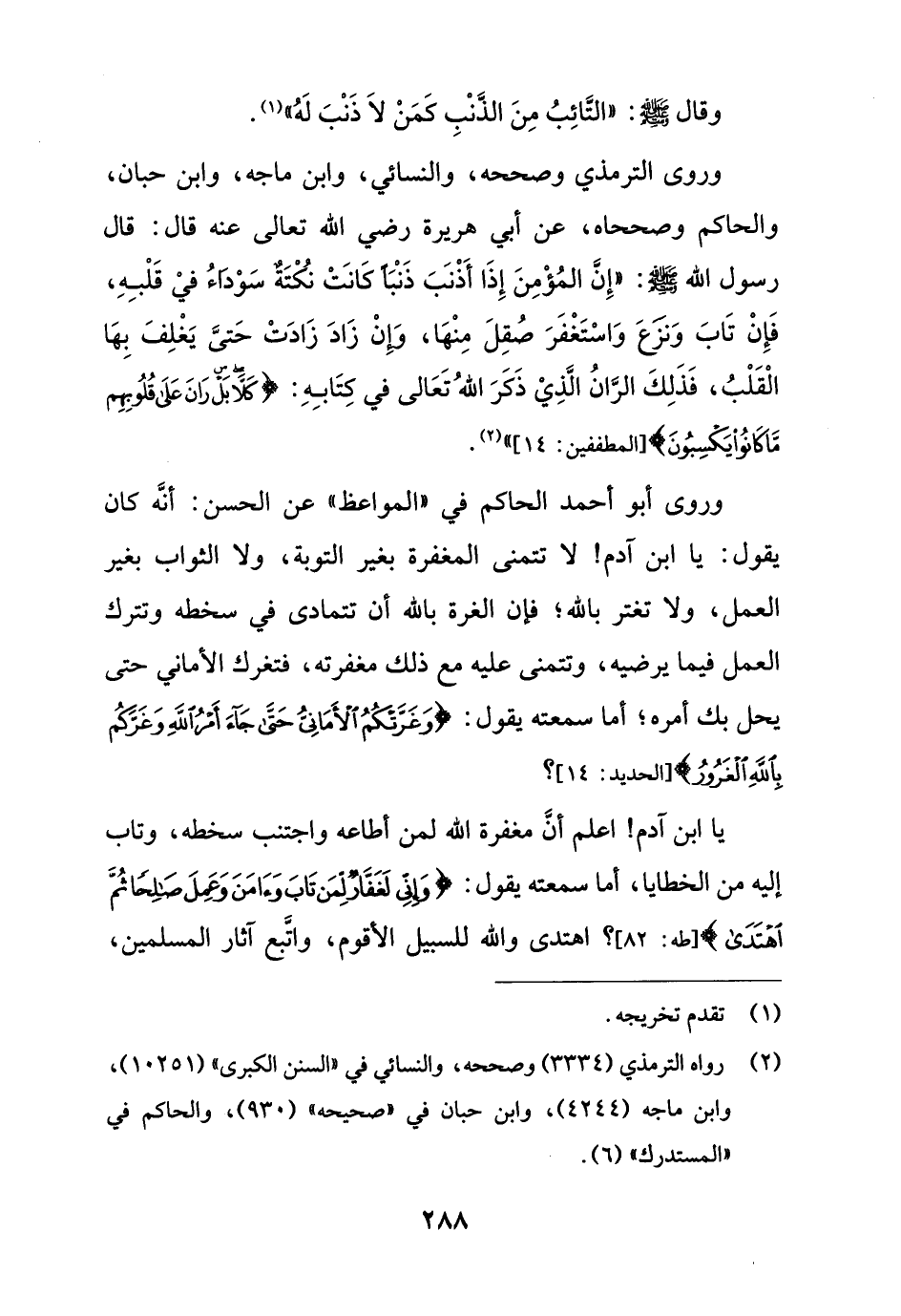 وروى الترمذي وصححه، والنسائي، وابن ماجه، وابن حبان، والحاكم وصححاه، عن أبي هريرة رضي الله تعالى عنه قال: قال رسول الله - صلى الله عليه وسلم -: "إِنَّ المُؤْمِنَ إِذَا أَذْنَبَ ذَنْبًا كَانَتْ نُكْتَةٌ سَوْدَاءُ فيْ قَلْبِهِ، فَإِنْ تَابَ وَنزَعَ وَاسْتَغْفَرَ صُقِلَ مِنْهَا، وَإِنْ زَادَ زَادَتْ حَتَّى يَغْلِفَ بِهَا الْقَلْبُ، فَذَلِكَ الرَّانُ الَّذِيْ ذَكَرَ اللهُ تَعَالى في كِتَابِهِ: {كَلَّا بَلْ رَانَ عَلَى قُلُوبِهِمْ مَا كَانُوا يَكْسِبُونَ (14)} [المطففين: 14] " (¬2).