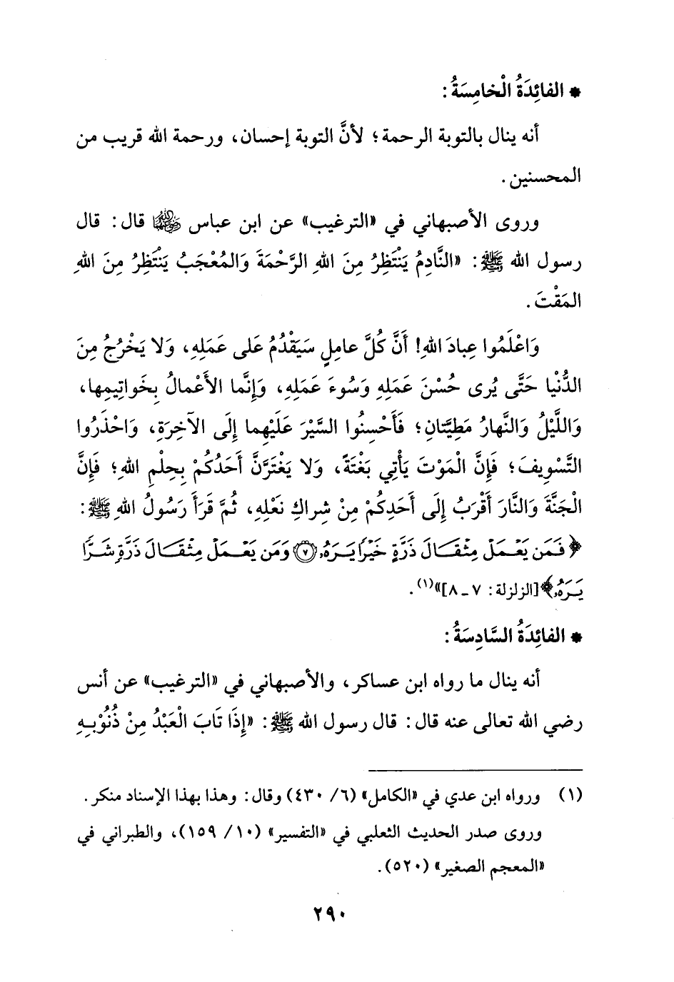 وروى الأصبهاني في "الترغيب" عن ابن عباس - رضي الله عنهما - قال: قال رسول الله - صلى الله عليه وسلم -: "النَّادِمُ يَنْتَظِرُ مِنَ اللهِ الرَّحْمَةَ وَالمُعْجَبُ يَنْتَظِرُ مِنَ اللهِ المَقْتَ.