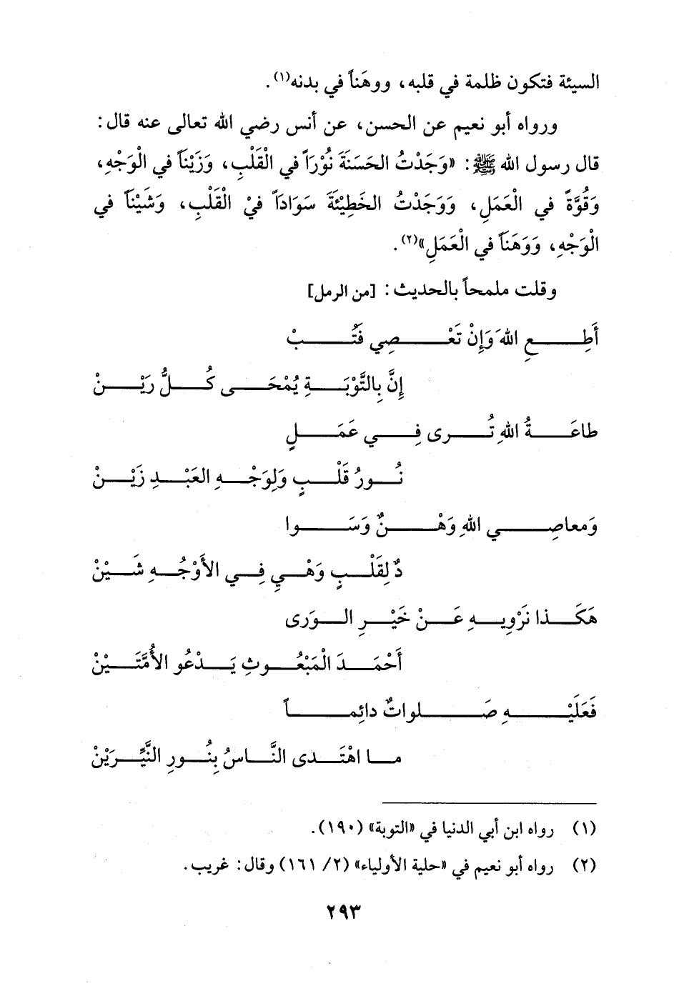ورواه أبو نعيم عن الحسن، عن أنس رضي الله تعالى عنه قال: قال رسول الله - صلى الله عليه وسلم -: "وَجَدْتُ الحَسَنَةَ نوْرًا في الْقَلْبِ، وَزَيْنًا في الْوَجْهِ، وَقُوَّةً في الْعَمَلِ، وَوَجَدْتُ الخَطِيْئَةَ سَوَادًا فيْ الْقَلْبِ، وَشَيْنًا في الْوَجْهِ، وَوَهَنًا في الْعَمَلِ" (¬2).