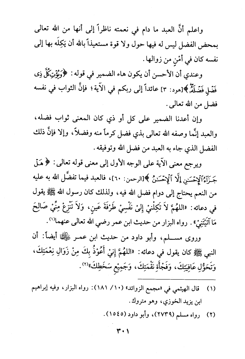 ويرجع معنى الآية على الوجه الأول إلى معنى قوله تعالى: {هَلْ جَزَاءُ الْإِحْسَانِ إِلَّا الْإِحْسَانُ} [الرحمن: 60]، فالعبد فيما تفضَّل الله به عليه من النعم يحتاج إلى دوام فضل الله فيه، ولذلك كان رسول الله - صلى الله عليه وسلم - يقول في دعائه: "اللهُمَّ لاَ تَكِلْنيْ إِلىْ نَفْسِيْ طَرْفَةَ عَينٍ، وَلاَ تَنْزِعْ مِنِّيْ صالح مَا آتَيْتَنِيْ". رواه البزار من حديث ابن عمر رضي الله تعالى عنهما (¬1).
