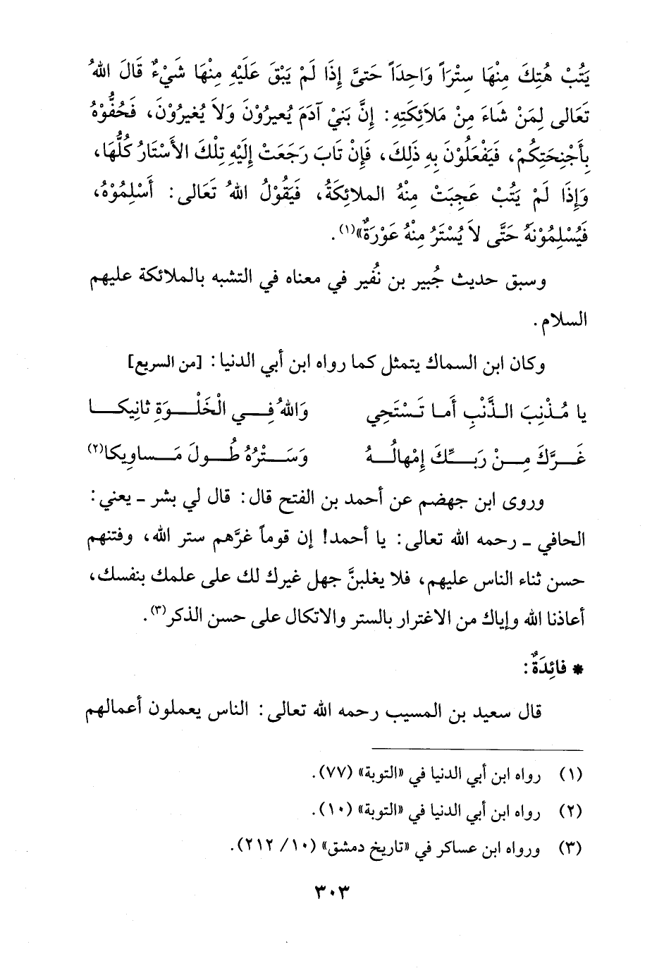 وروى ابن جهضم عن أحمد بن الفتح قال: قال لي بشر -يعني: الحافي- رحمه الله تعالى: يا أحمد! إن قومًا غرَّهم ستر الله، وفتنهم حسن ثناء الناس عليهم، فلا يغلبنَّ جهل غيرك لك على علمك بنفسك، أعاذنا الله وإيّاك من الاغترار بالستر والاتكال على حسن الذكر (¬3).