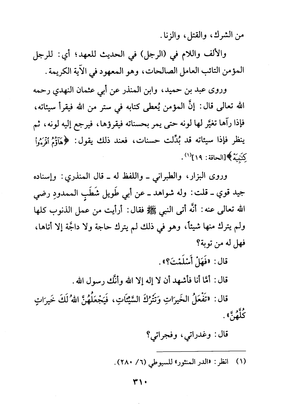 وروى عبد بن حميد، وابن المنذر عن أبي عثمان النهدي رحمه الله تعالى قال: إنَّ المؤمن يُعطى كتابه في ستر من الله فيقرأ سيئاته، فإذا رآها تغير لها لونه حتى يمر بحسناته فيقرؤها، فيرجع إليه لونه، ثم ينظر فإذا سيئاته قد بُدّلت حسنات، فعند ذلك يقول: {هَاؤُمُ اقْرَءُوا كِتَابِيَهْ} [الحاقة: 19] (¬1).