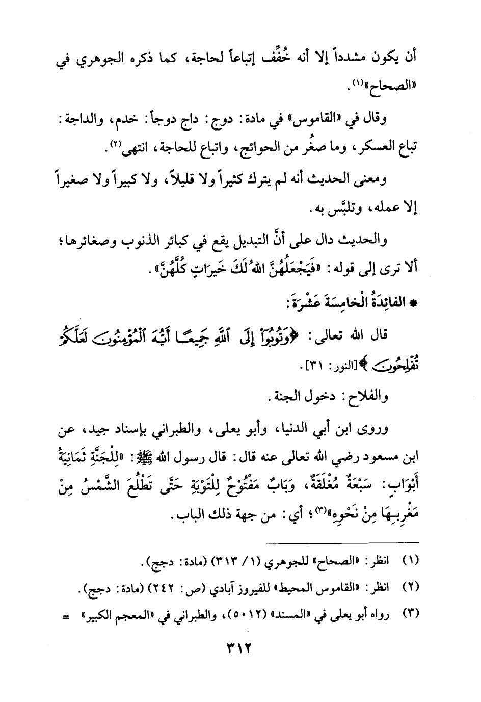 وروى ابن أبي الدنيا، وأبو يعلى، والطبراني بإسناد جيد، عن ابن مسعود رضي الله تعالى عنه قال: قال رسول الله - صلى الله عليه وسلم -: "لِلْجَنَّةِ ثَمَانِيةُ أَبْوَابٍ: سَبْعَةٌ مُغْلَقَةٌ، وَبَابٌ مَفْتُوْحٌ لِلْتَّوْبَةِ حَتَّى تَطْلُعَ الشَّمْسُ مِنْ مَغْرِبِهَا مِنْ نَحْوه" (¬3)؛ أي: من جهة ذلك الباب.