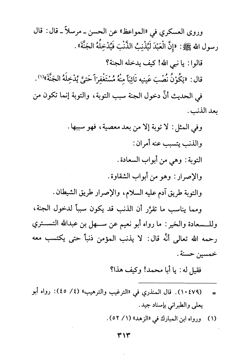 ومما يناسب ما تقرَّر أن الذنب قد يكون سببًا لدخول الجنة، وللسعادة والخير: ما رواه أبو نعيم عن سهل بن عبد الله التستري رحمه الله تعالى أنَّه قال: لا يذنب المؤمن ذنباً حتى يكتسب معه خمسين حسنة.