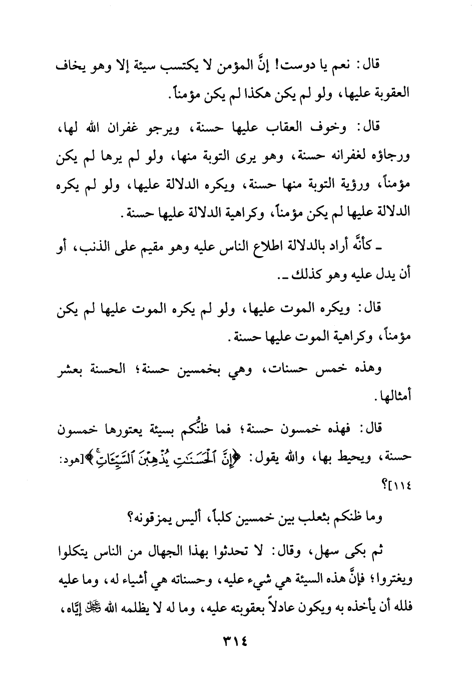 ثم بكى سهل، وقال: لا تحدثوا بهذا الجهال من الناس يتكلوا ويغتروا؛ فإنَّ هذه السيئة هي شيء عليه، وحسناته هي أشياء له، وما عليه فلله أن يأخذه به ويكون عادلاً بعقوبته عليه، وما له لا يظلمه الله عز وجل إيَّاه،