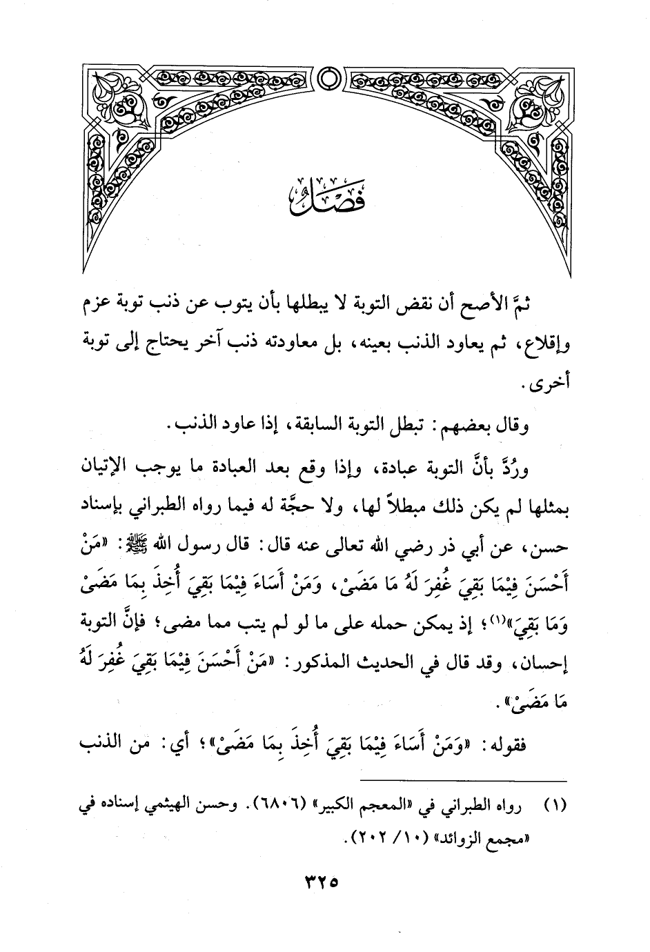 ورُدَّ بأنَّ التوبة عبادة، وإذا وقع بعد العبادة ما يوجب الإتيان بمثلها لم يكن ذلك مبطلاً لها, ولا حجَّة له فيما رواه الطبراني بإسناد حسن، عن أبي ذر رضي الله تعالى عنه قال: قال رسول الله - صلى الله عليه وسلم -: "مَنْ أَحْسَنَ فِيْمَا بَقِيَ غُفِرَ لَهُ مَا مَضَىْ، وَمَنْ أَسَاءَ فِيْمَا بَقِيَ أُخِذَ بِمَا مَضَىْ وَمَا بَقِيَ" (¬1)؛ إذ يمكن حمله على ما لو لم يتب مما مضى؛ فإنَّ التوبة إحسان، وقد قال في الحديث المذكور: "مَنْ أَحْسَنَ فِيْمَا بَقِيَ غُفِرَ لَهُ مَا مَضَىْ".