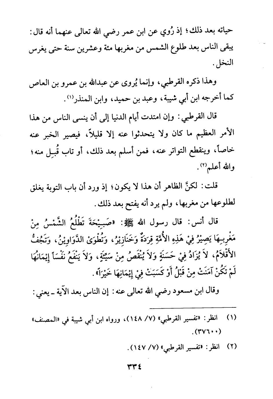 قال أنس: قال رسول الله - صلى الله عليه وسلم -: "صَبِيْحَةَ تَطْلُعُ الشَّمْسُ مِنْ مَغْرِبِهَا يَصِيْرُ فِيْ هَذِهِ الأُمَّةِ قِرَدَةٌ وَخَنَازيرُ، وَتُطْوَىْ الدَّوَاوِيْنُ، وَتَجُفُّ الأَقْلاَمُ، لاَ يُزَادُ فِيْ حَسَنَةٍ وَلاَ يُنْقَصُ مِنْ سَيئةٍ، وَلاَ يَنْفَعُ نَفْسًا إِيْمَانها لَمْ تَكُنْ آمَنَتْ مِنْ قَبْلُ أَوْ كَسَبَت فِيْ إِيْمَانِهَا خَيْرًا".