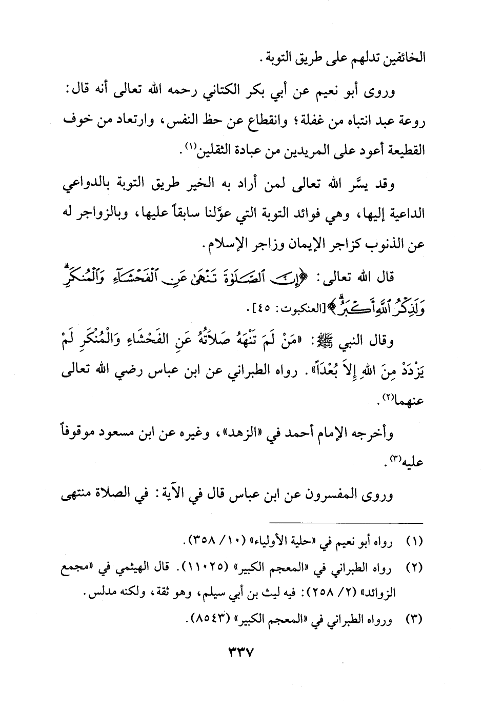 وقال النبي - صلى الله عليه وسلم -: "مَنْ لَمَ تَنْهَهُ صَلاَتُهُ عَنِ الفَحْشَاءِ وَالْمُنْكَرِ لَمْ يَزْدَدْ مِنَ اللهِ إِلاَّ بُعْدًا". رواه الطبراني عن ابن عباس رضي الله تعالى عنهما (¬2).
