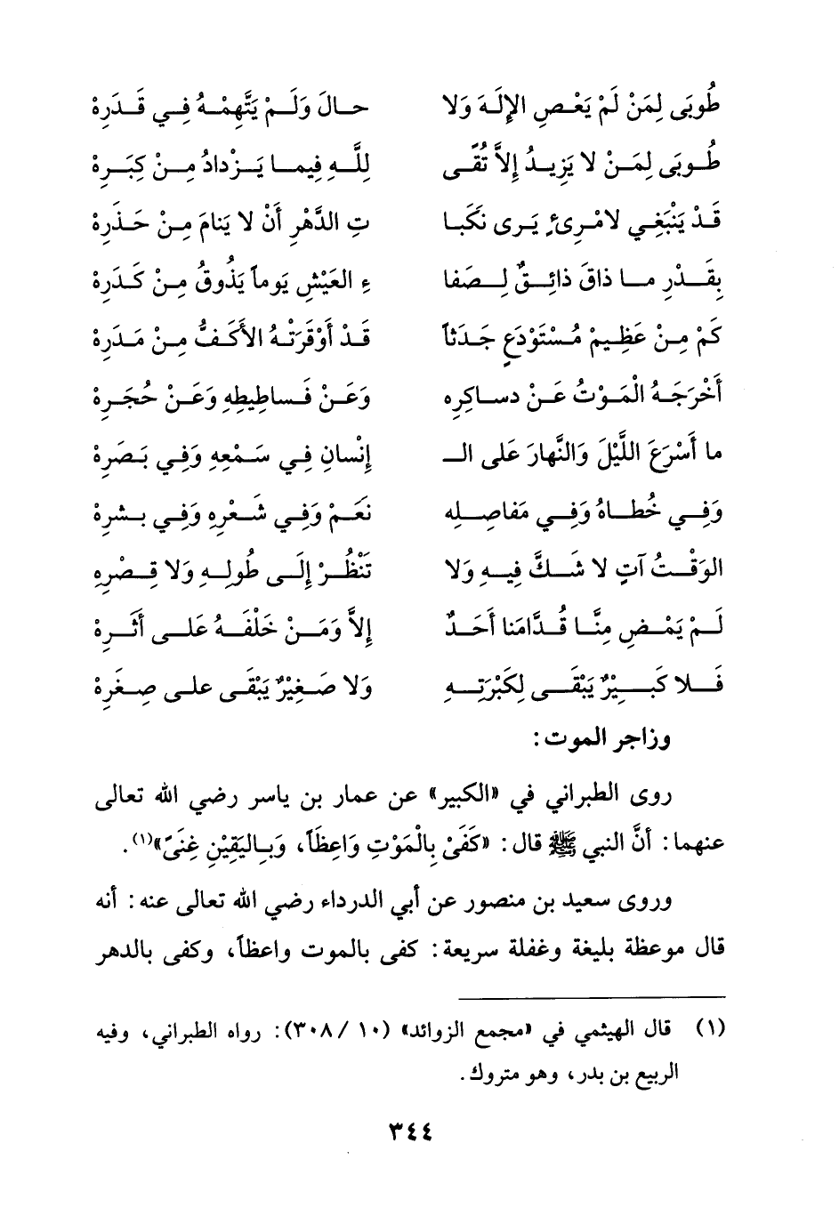 وروى سعيد بن منصور عن أبي الدرداء رضي الله تعالى عنه: أنه قال موعظة بليغة وغفلة سريعة: كفى بالموت واعظاً، وكفى بالدهر