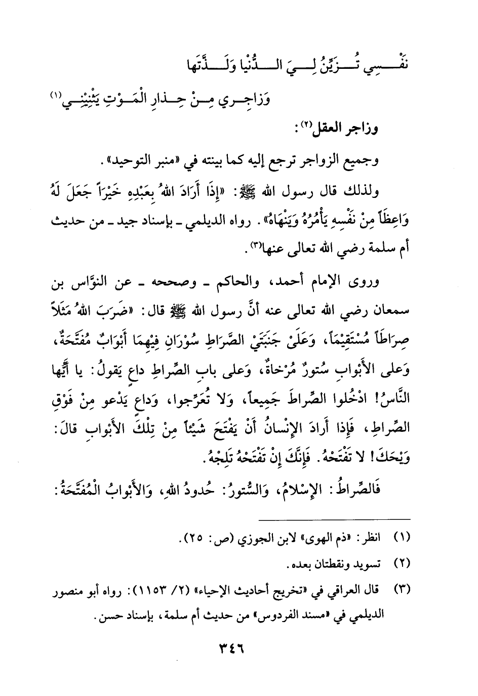 وروى الإِمام أحمد، والحاكم -وصححه- عن النوَّاس بن سمعان رضي الله تعالى عنه أنَّ رسول الله - صلى الله عليه وسلم - قال: "ضَرَبَ اللهُ مَثَلًا صِرَاطًا مُسْتَقِيْمًا، وَعَلَىْ جَنَبَتَيْ الصَّرَاطِ سُوْرَانِ فِيْهِمَا أَبْوَابٌ مُفتَّحَةٌ، وَعلى الأَبْوابِ سُتورٌ مُرْخاةٌ، وَعلى بابِ الصِّراطِ داع يَقولُ: يا أيُّها النَّاسُ! ادْخُلوا الصّراطَ جَمِيعًا، وَلا تُعَرِّجوا، وَداعٍ يَدْعو مِنْ فَوْقِ الصِّراطِ، فَإِذا أَرادَ الإِنْسانُ أَنْ يَفْتَحَ شَيْئًا مِنْ تِلْكَ الأَبْوابِ قالَ: وَيْحَكَ! لا تَفْتَحْهُ. فَإِنَّكَ إِنْ تَفْتَحْهُ تَلِجْهُ.