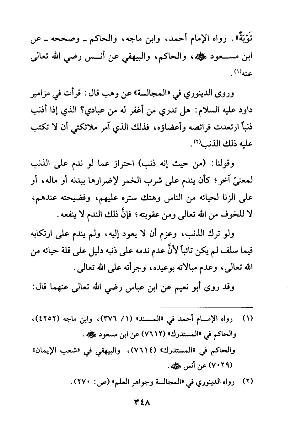 تَوْبَةٌ". رواه الإِمام أحمد، وابن ماجه، والحاكم -وصححه- عن ابن مسعود - رضي الله عنه -، والحاكم، والبيهقي عن أنس رضي الله تعالى عنه (¬1).