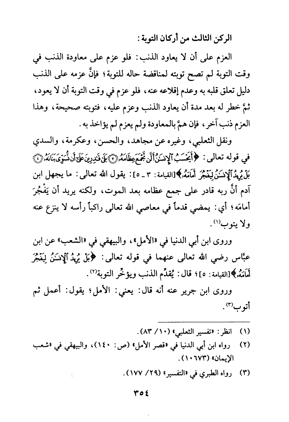 وروى ابن أبي الدنيا في "الأمل"، والبيهقي في "الشعب" عن ابن عبَّاس رضي الله تعالى عنهما في قوله تعالى: {بَلْ يُرِيدُ الْإِنْسَانُ لِيَفْجُرَ أَمَامَهُ} [القيامة: 5]؛ قال: يُقدم الذنب ويؤخر التوبة (¬2).